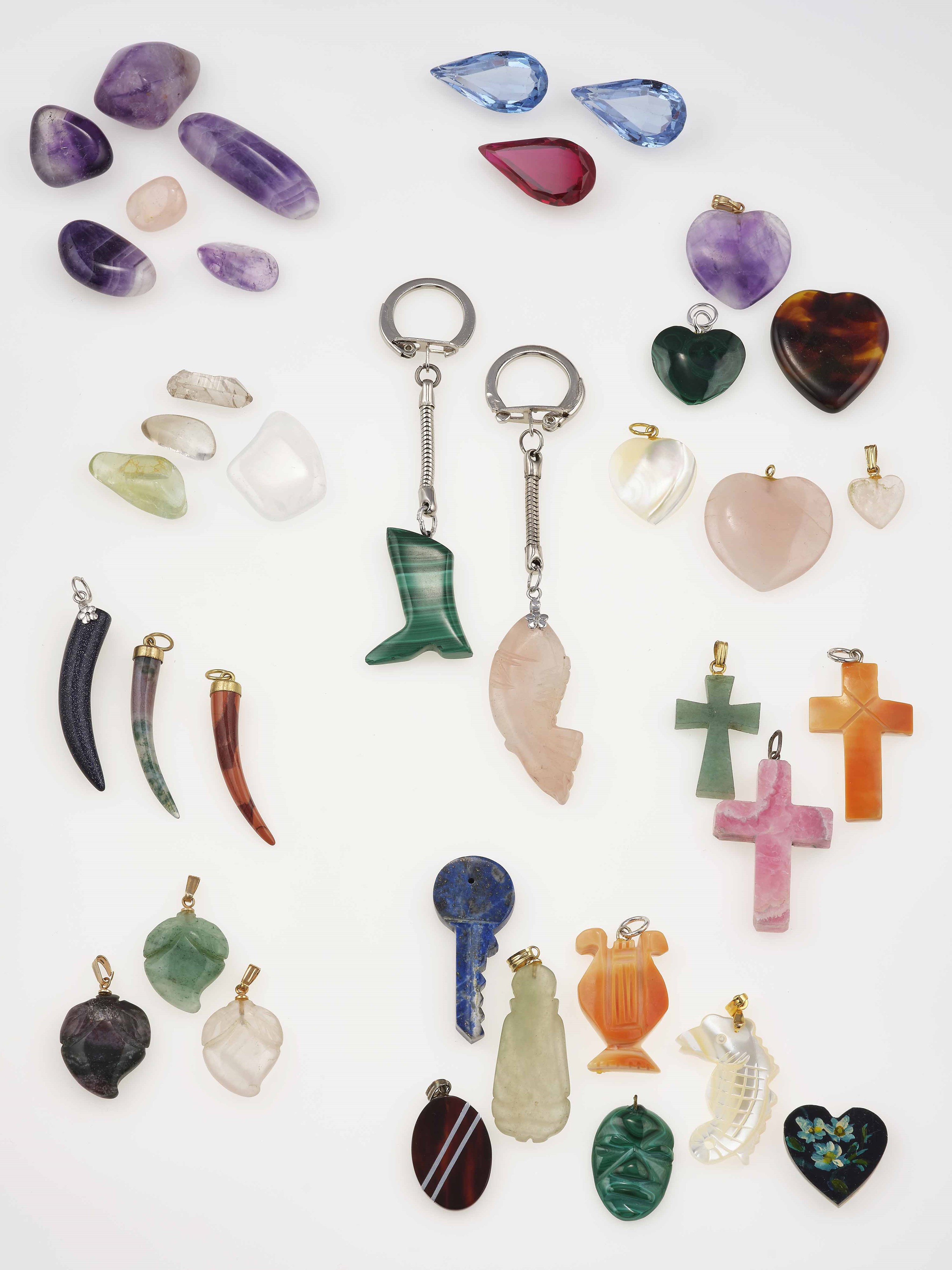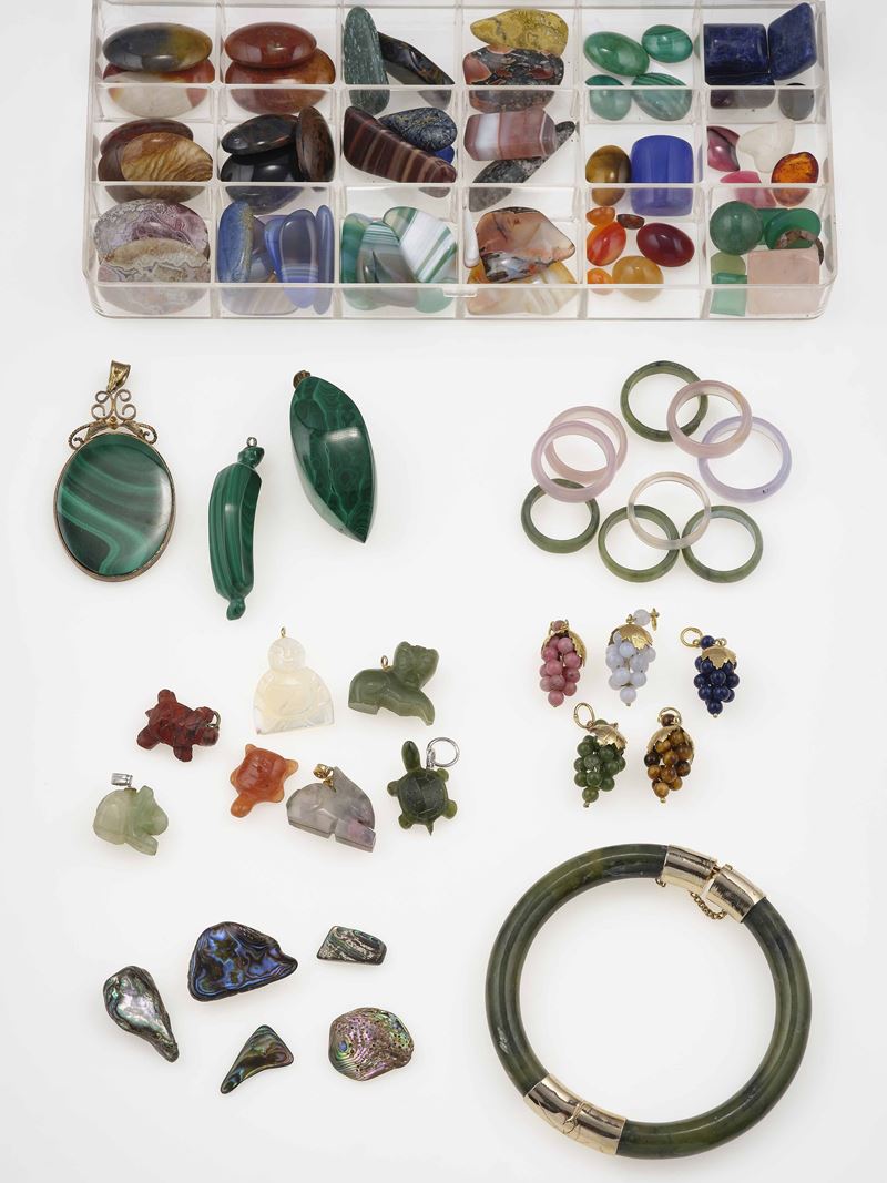Grande lotto composto da pietre dure materiali vari, gemme sintetiche montate e smontate, oggetti in corallo e conchiglia, [..]