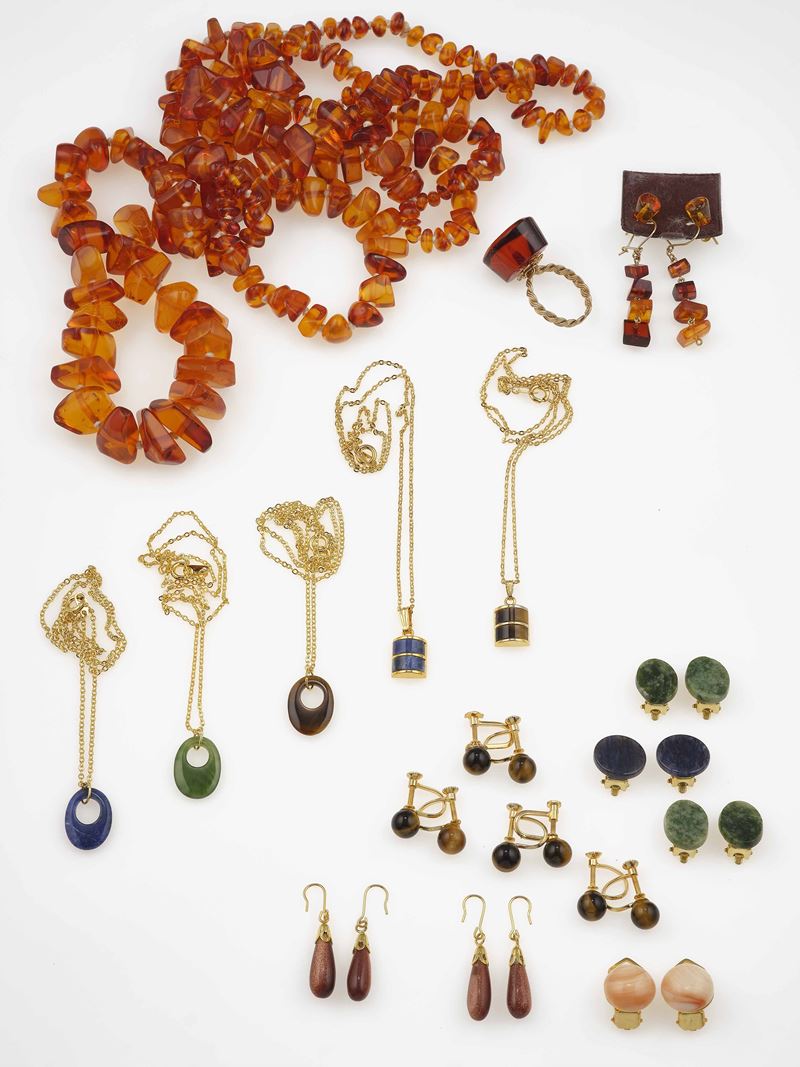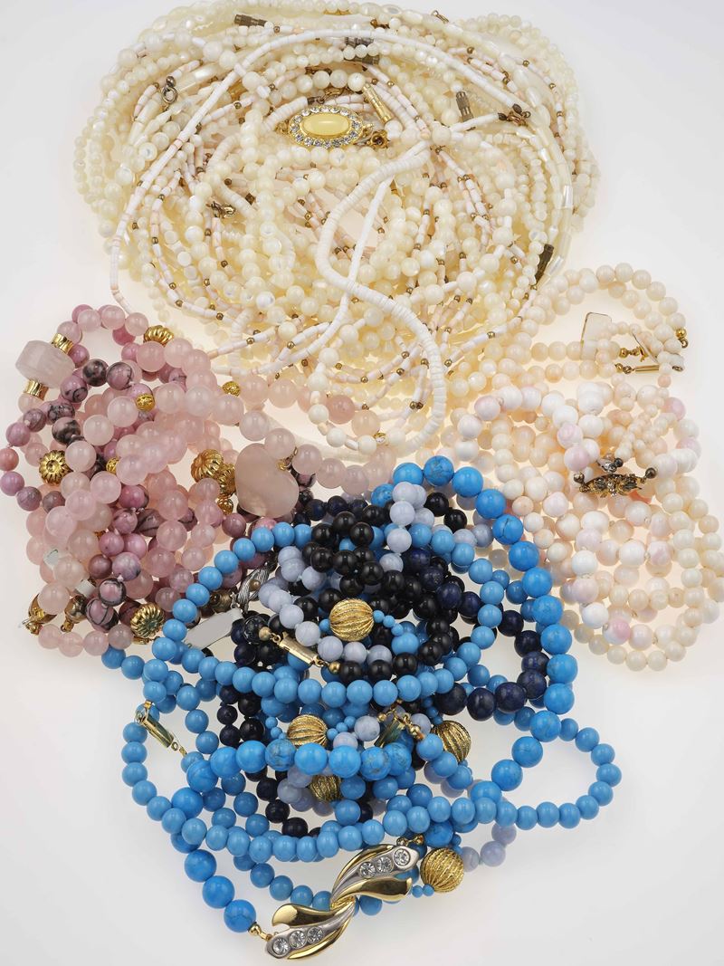 Grande lotto composto da pietre dure materiali vari, gemme sintetiche montate e smontate, oggetti in corallo e conchiglia, resine, oggetti in madre perla