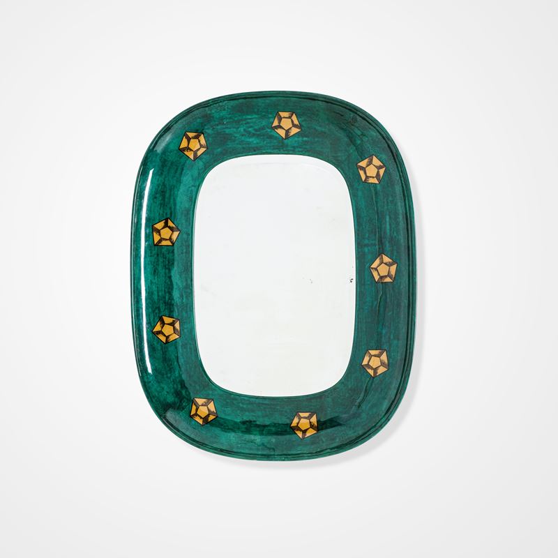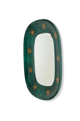Cornice in legno rivestita in pergamena colorata verde malachite e cristallo specchiato.