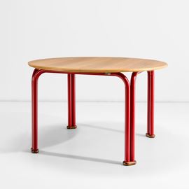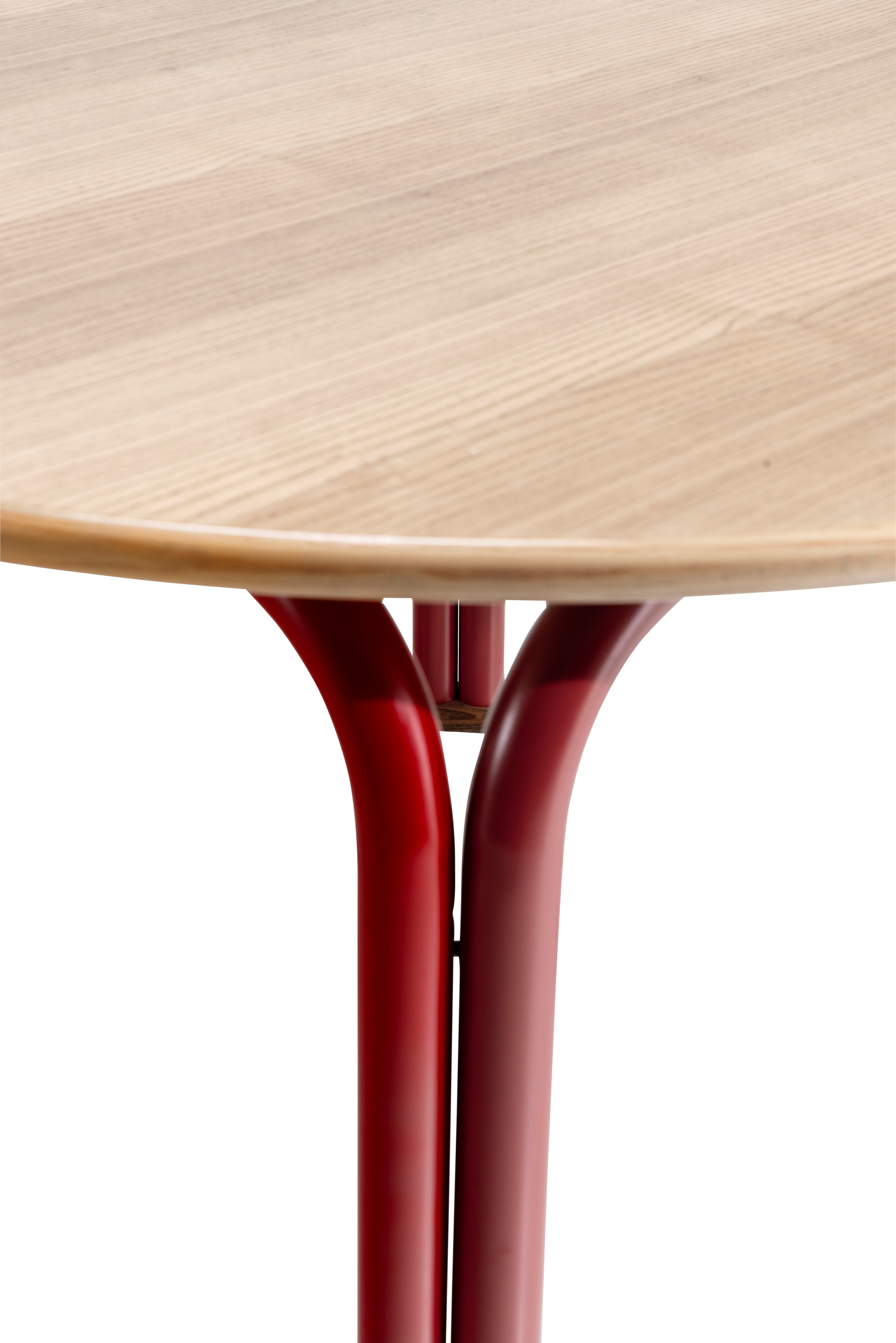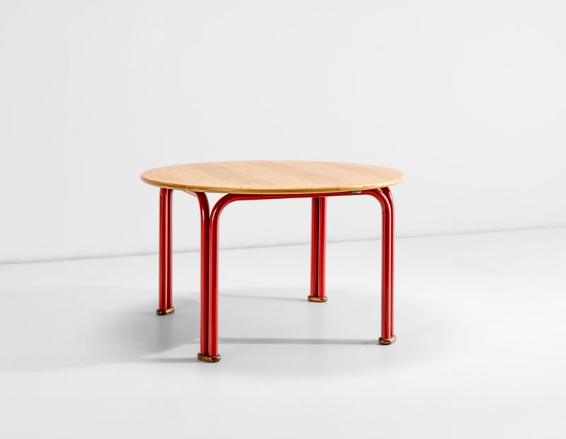 Sostegni in tubolare metallico laccato. Piano e puntali in legno.