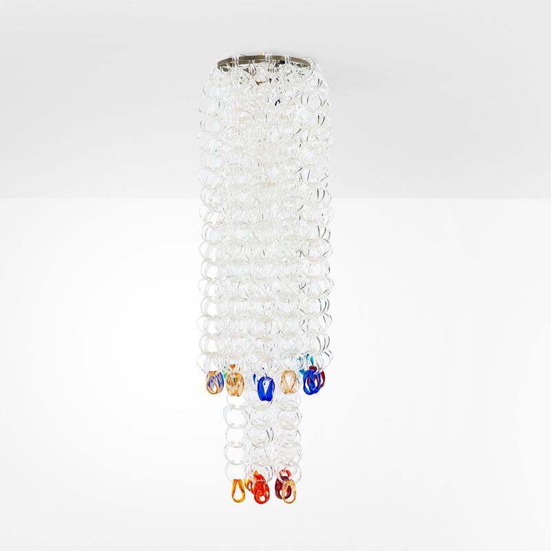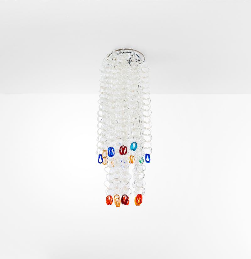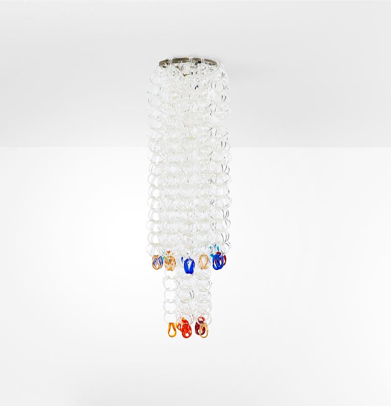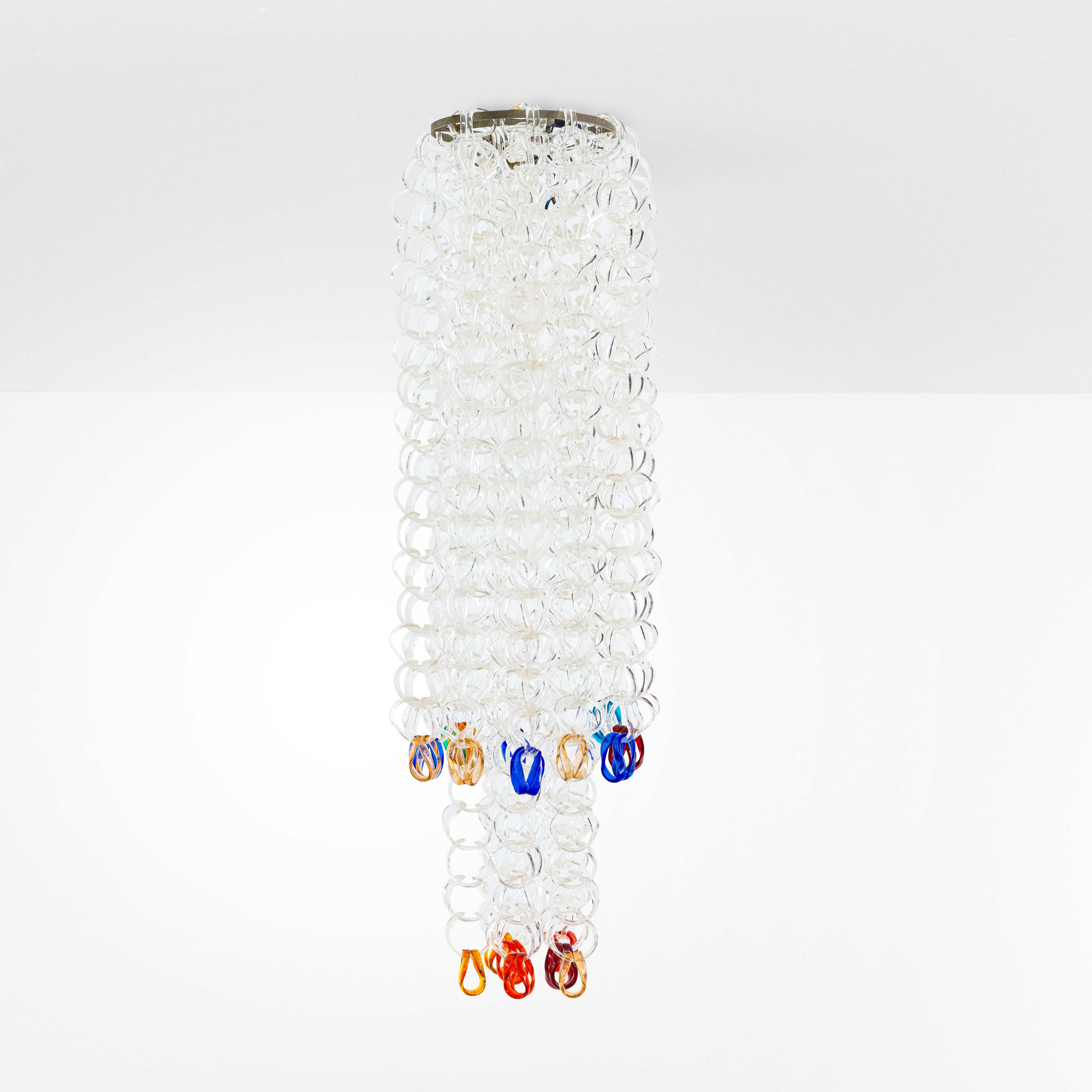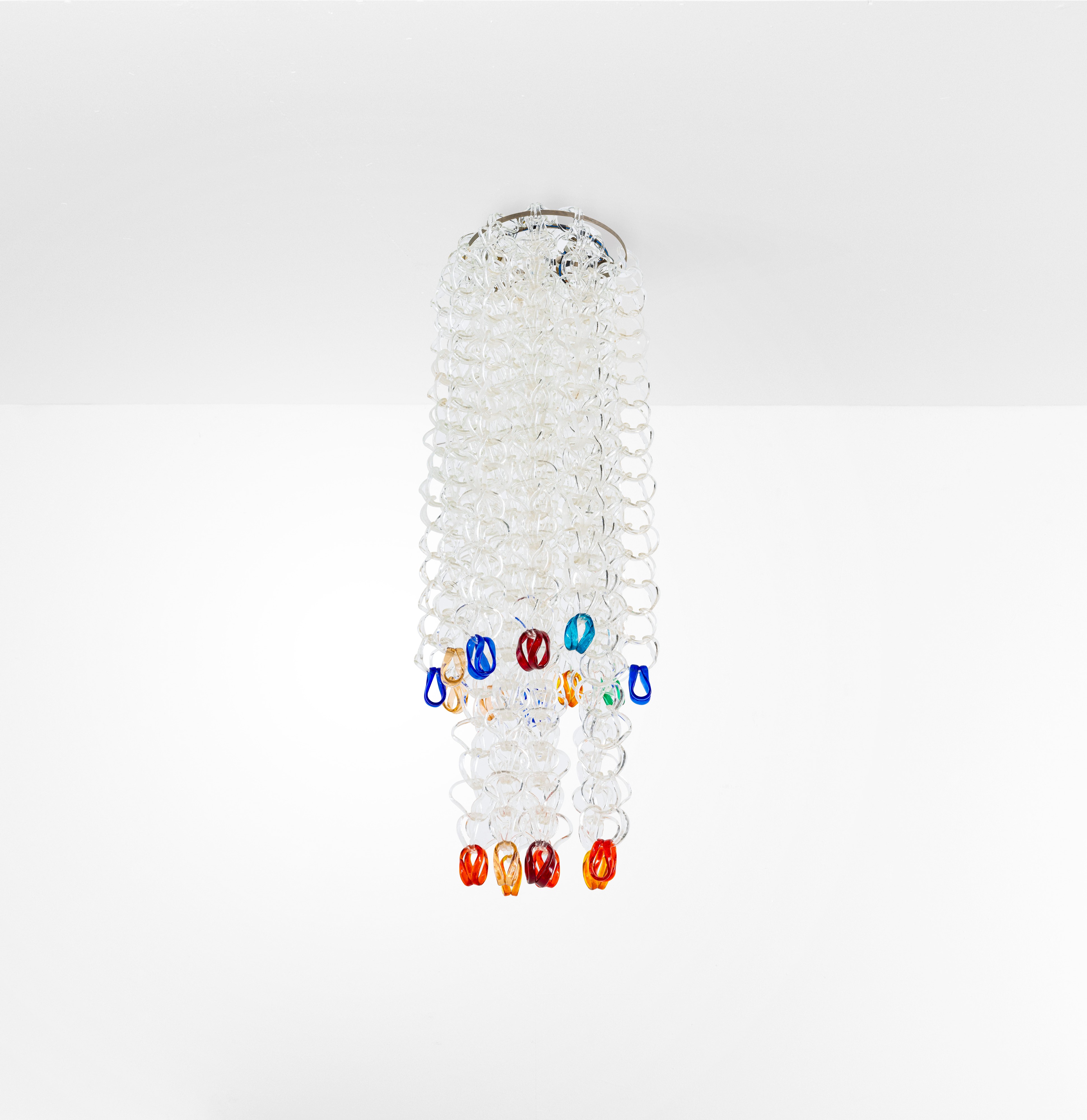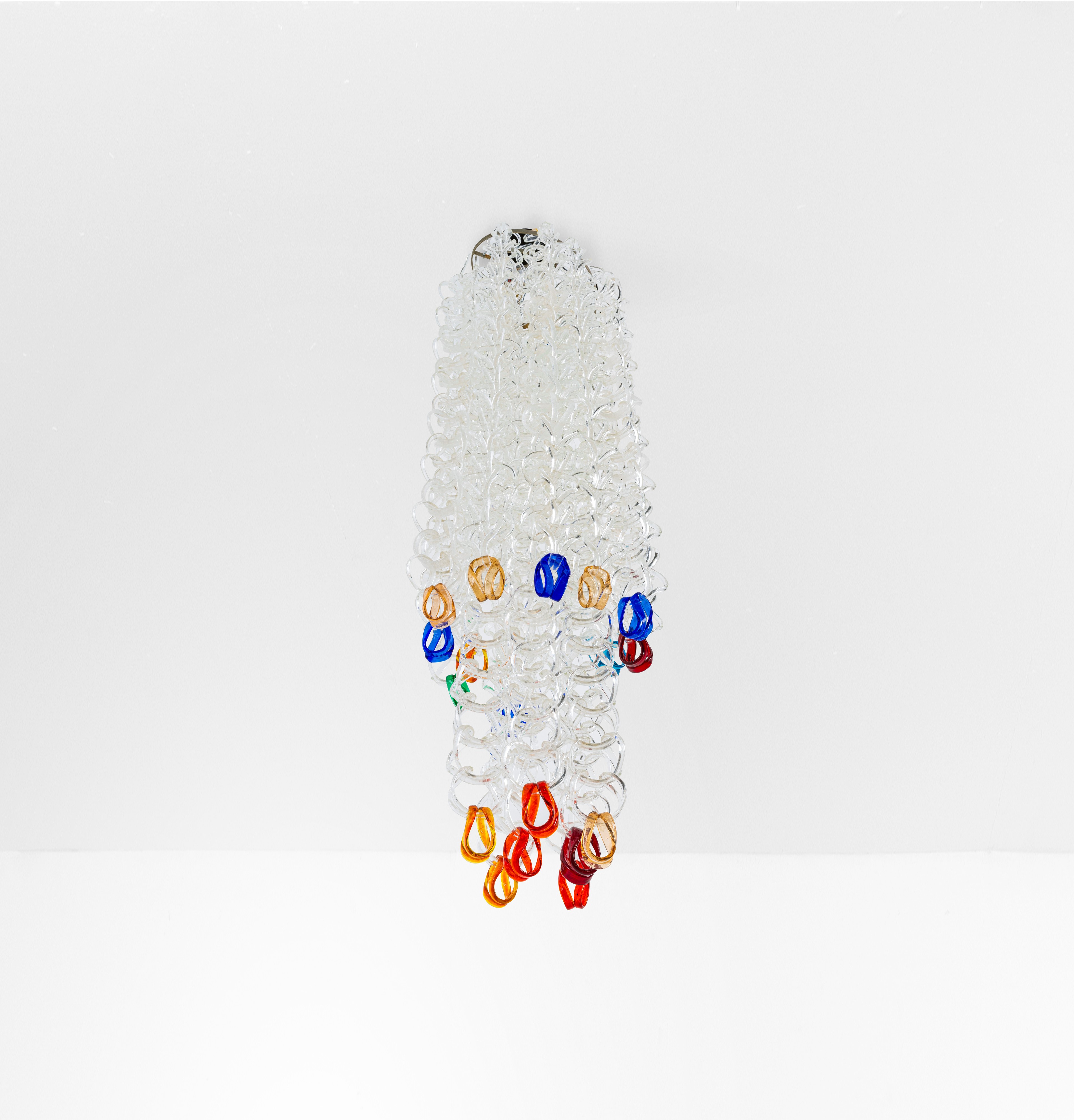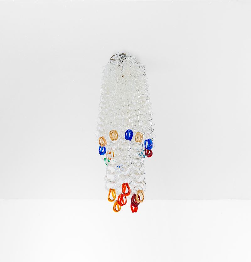Struttura in metallo ed elementi diffusori in vetro di Murano della serie Sella costituiti da ganci modulari componibili.