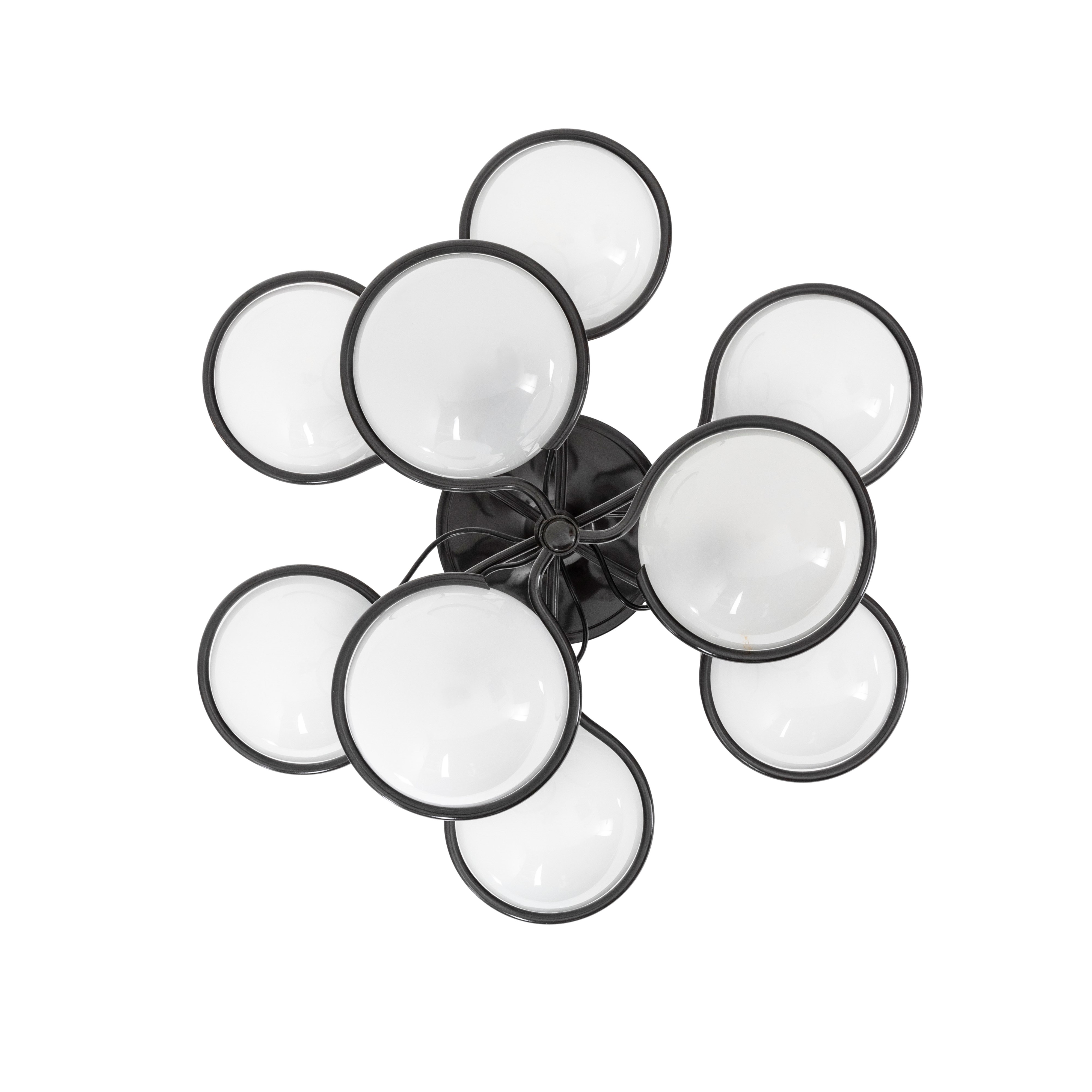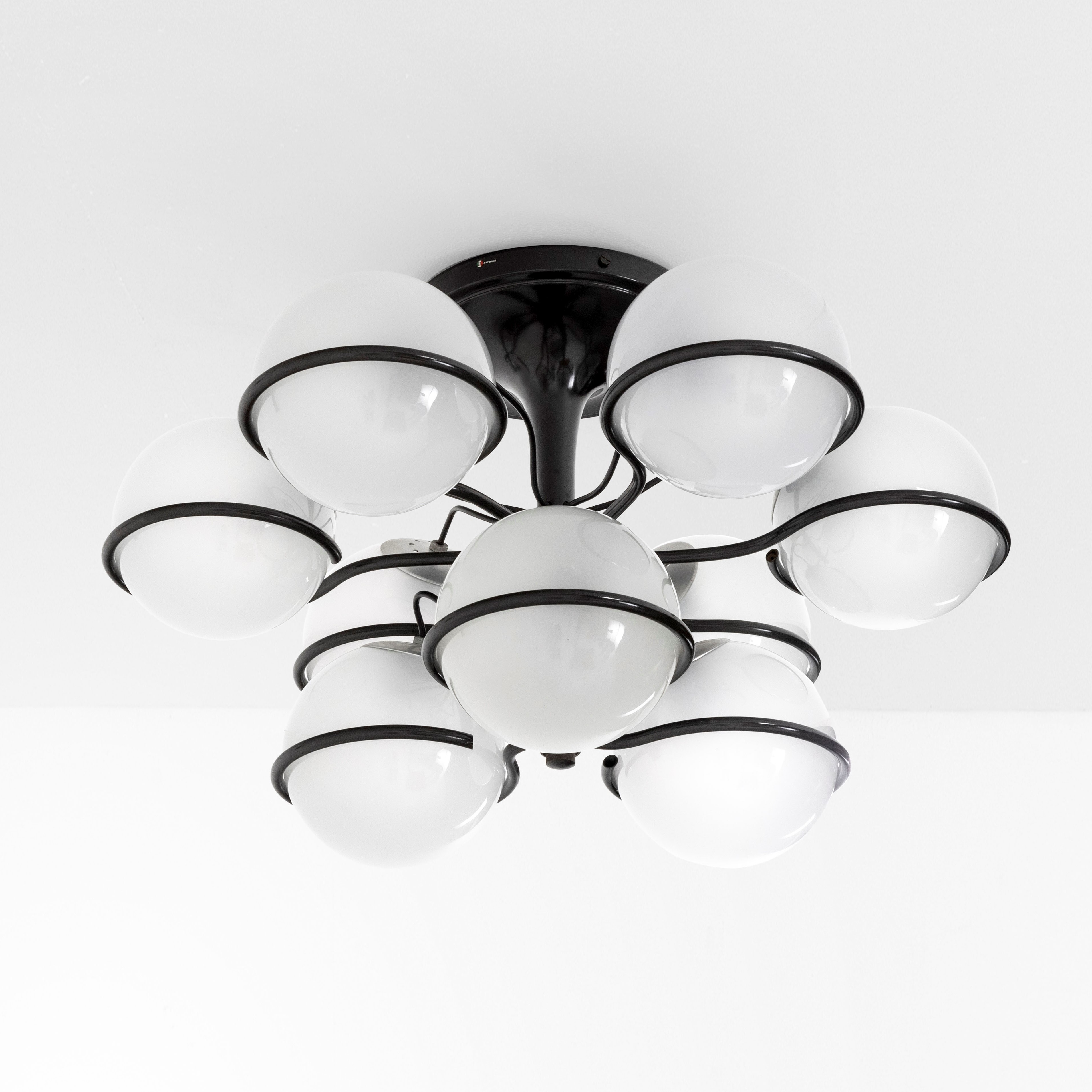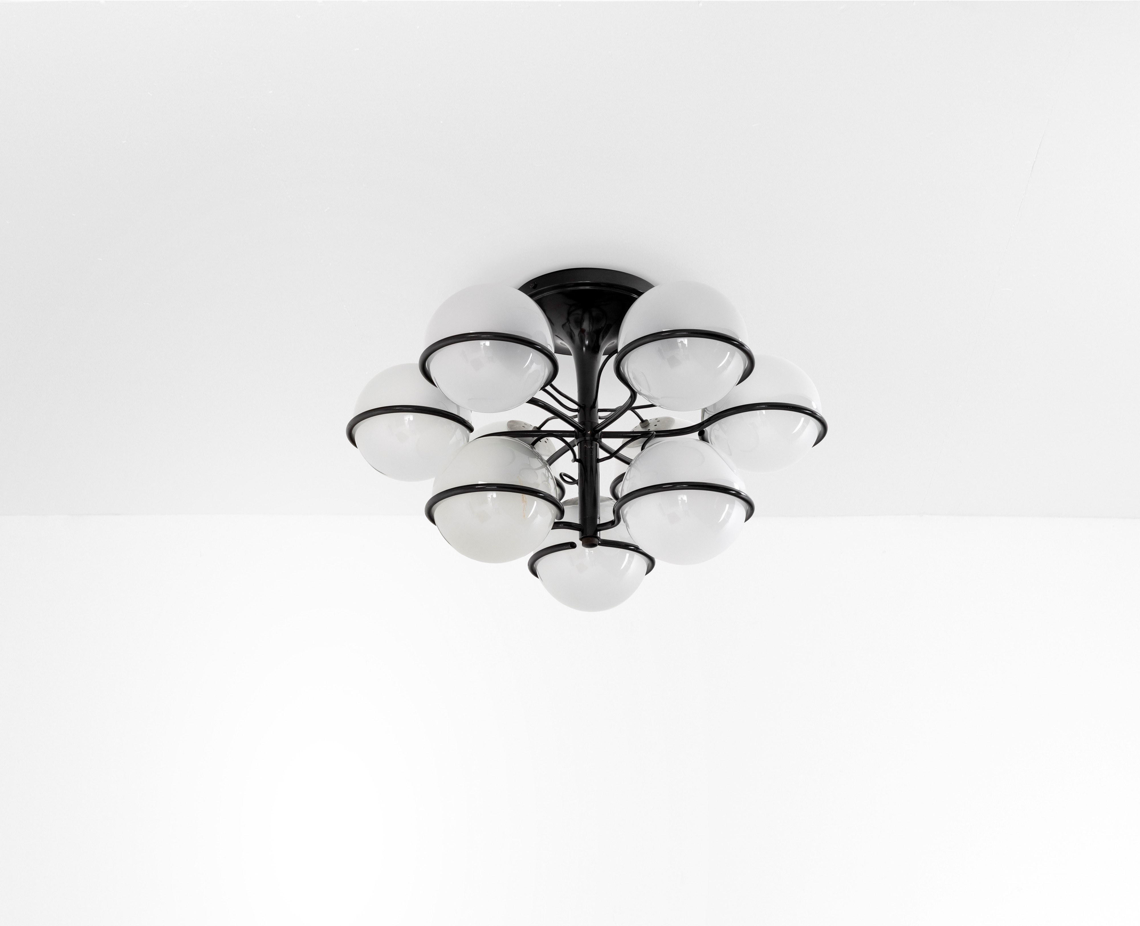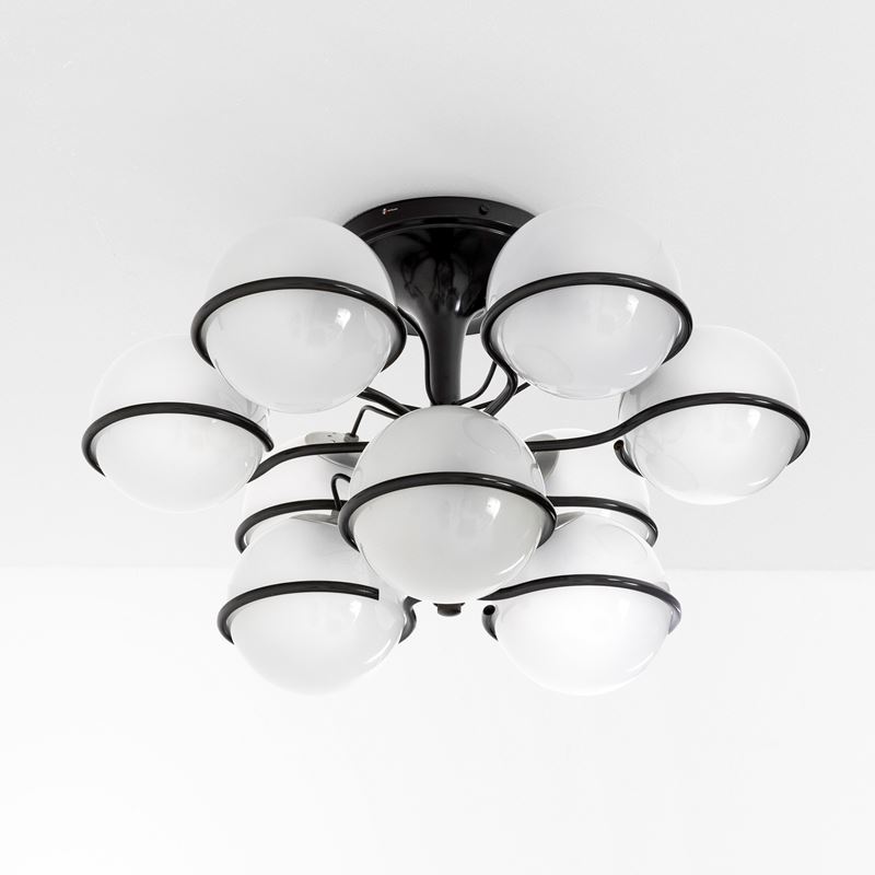 Struttura in metallo, metallo laccato e sfere in vetro satinato.