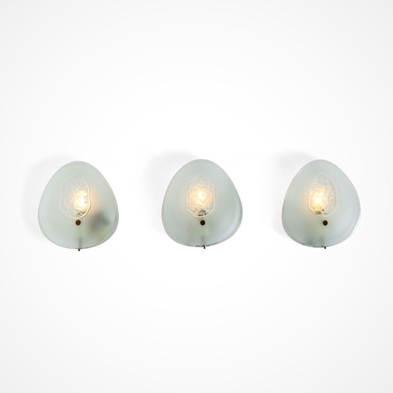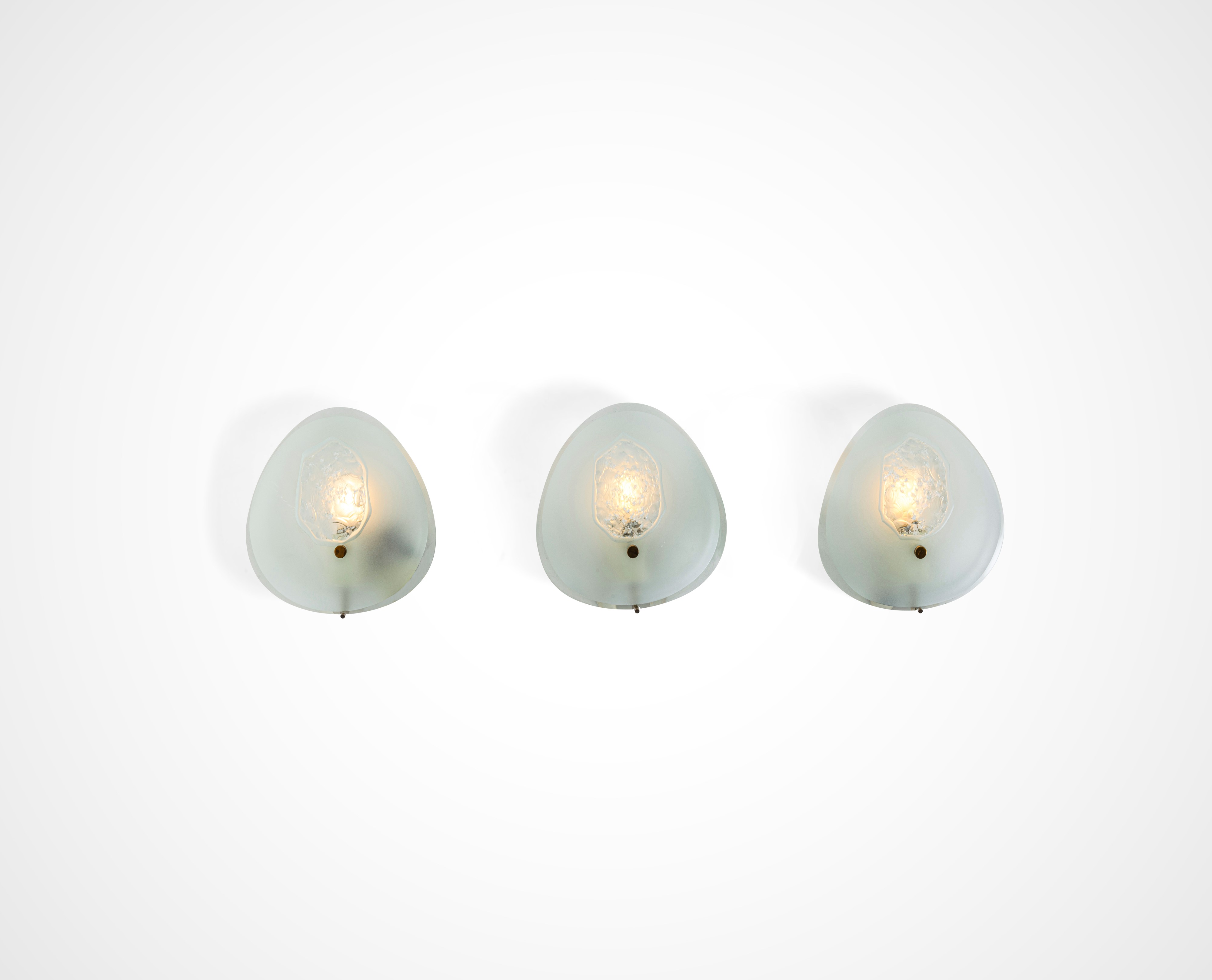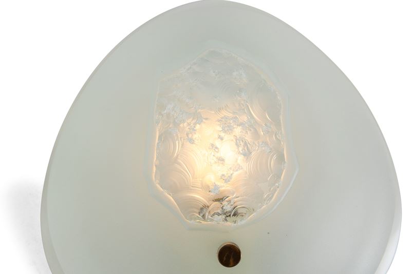 Struttura in ottone e metallo laccato. Diffusori in cristallo molato, acidato e scalpellato.