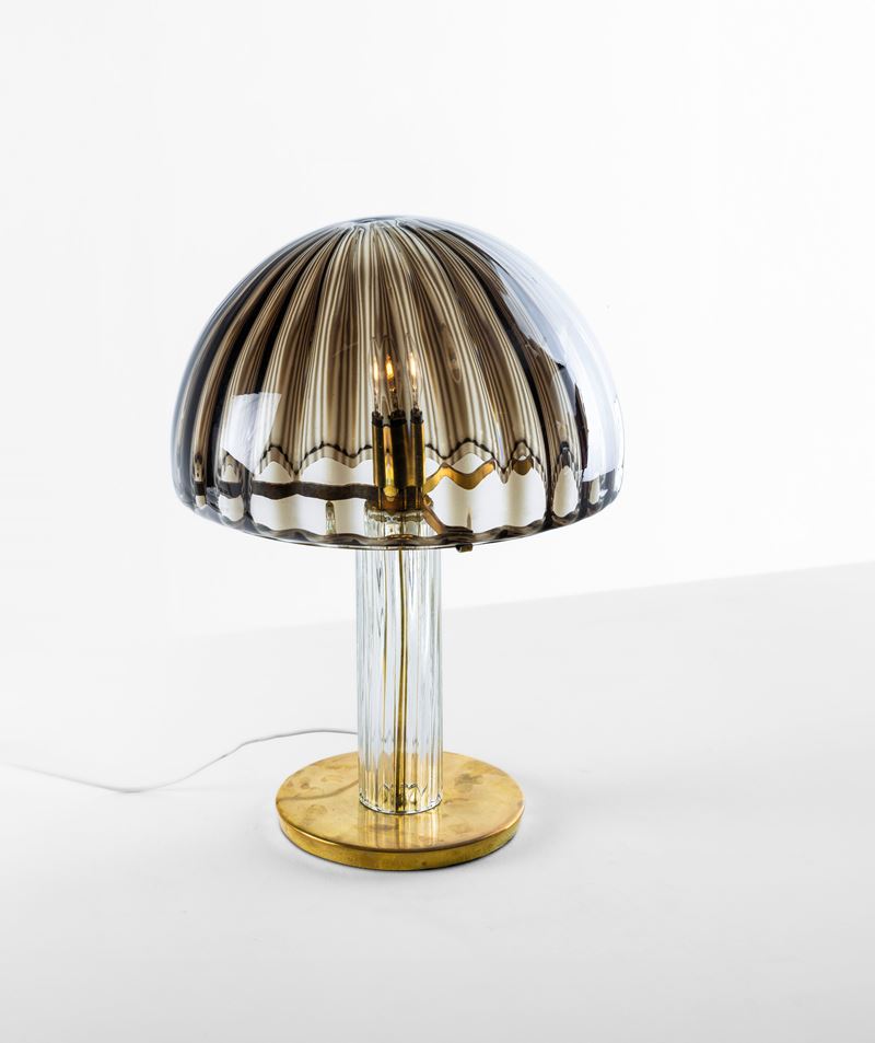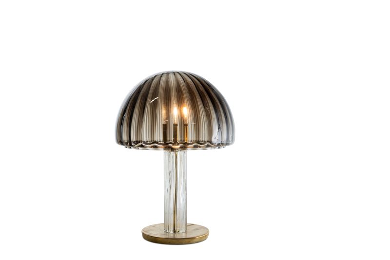 Struttura in ottone con calotta e fusto in vetro di Murano costolato.