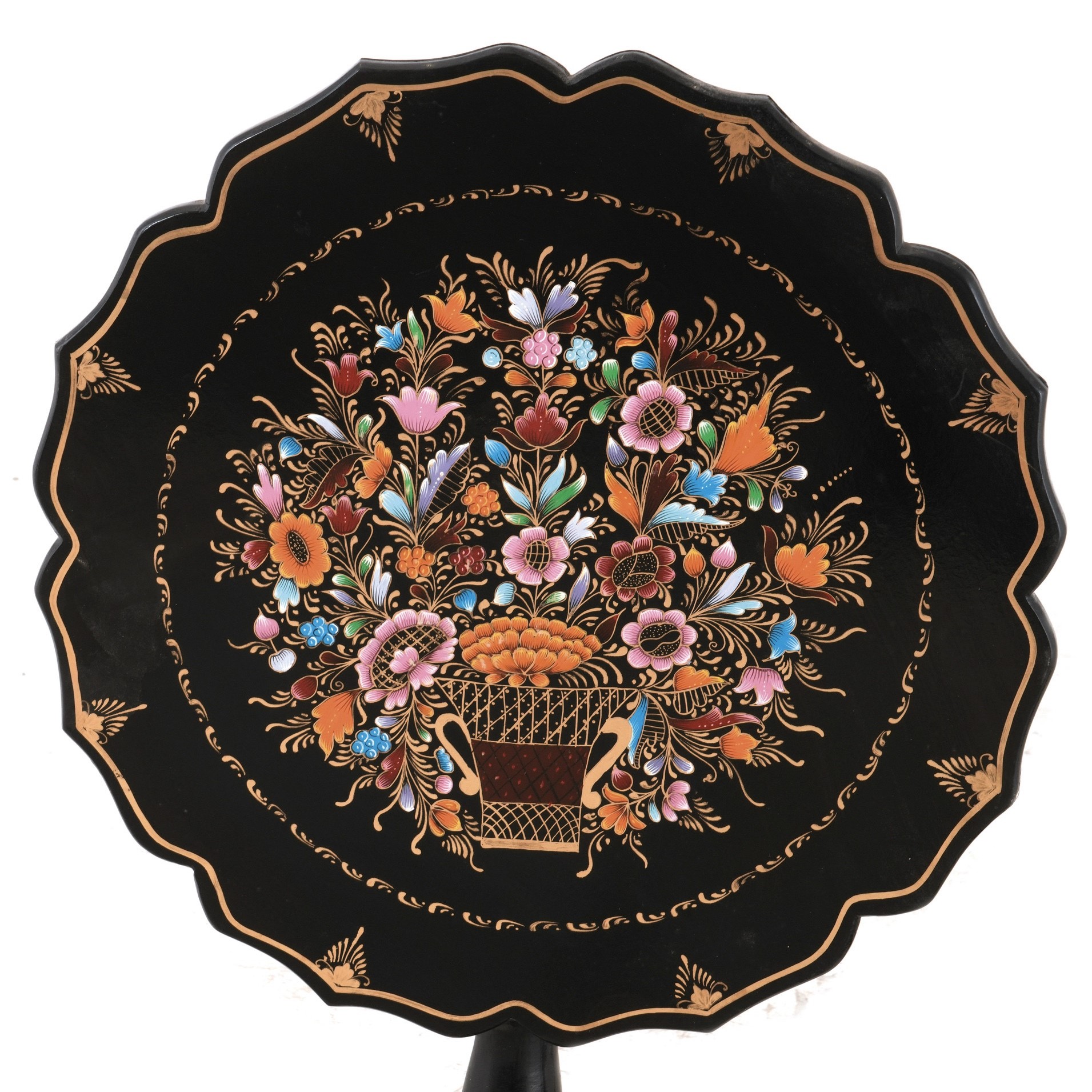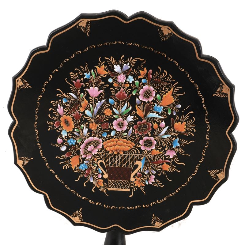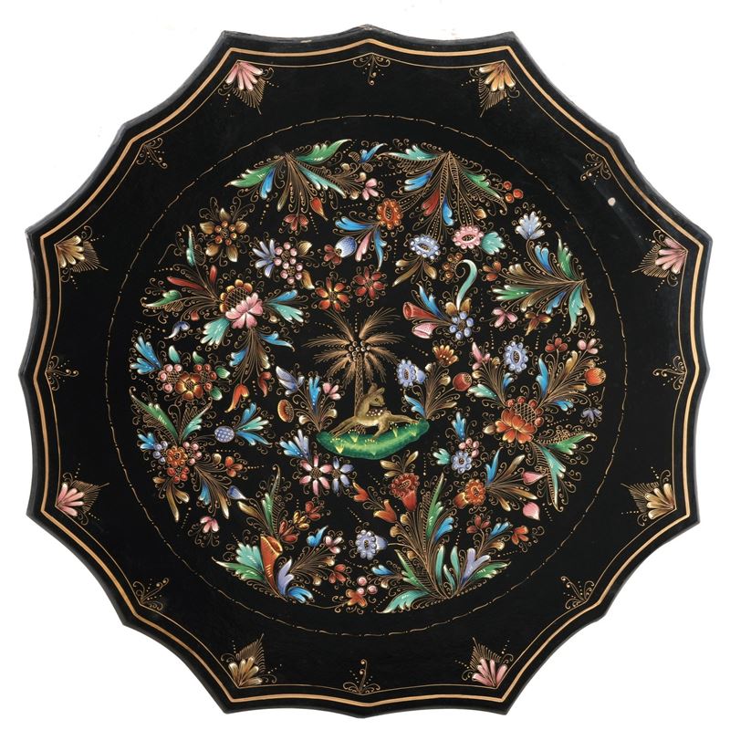 Due tavolini da gioco con decoro floreale policromo su fondo nero