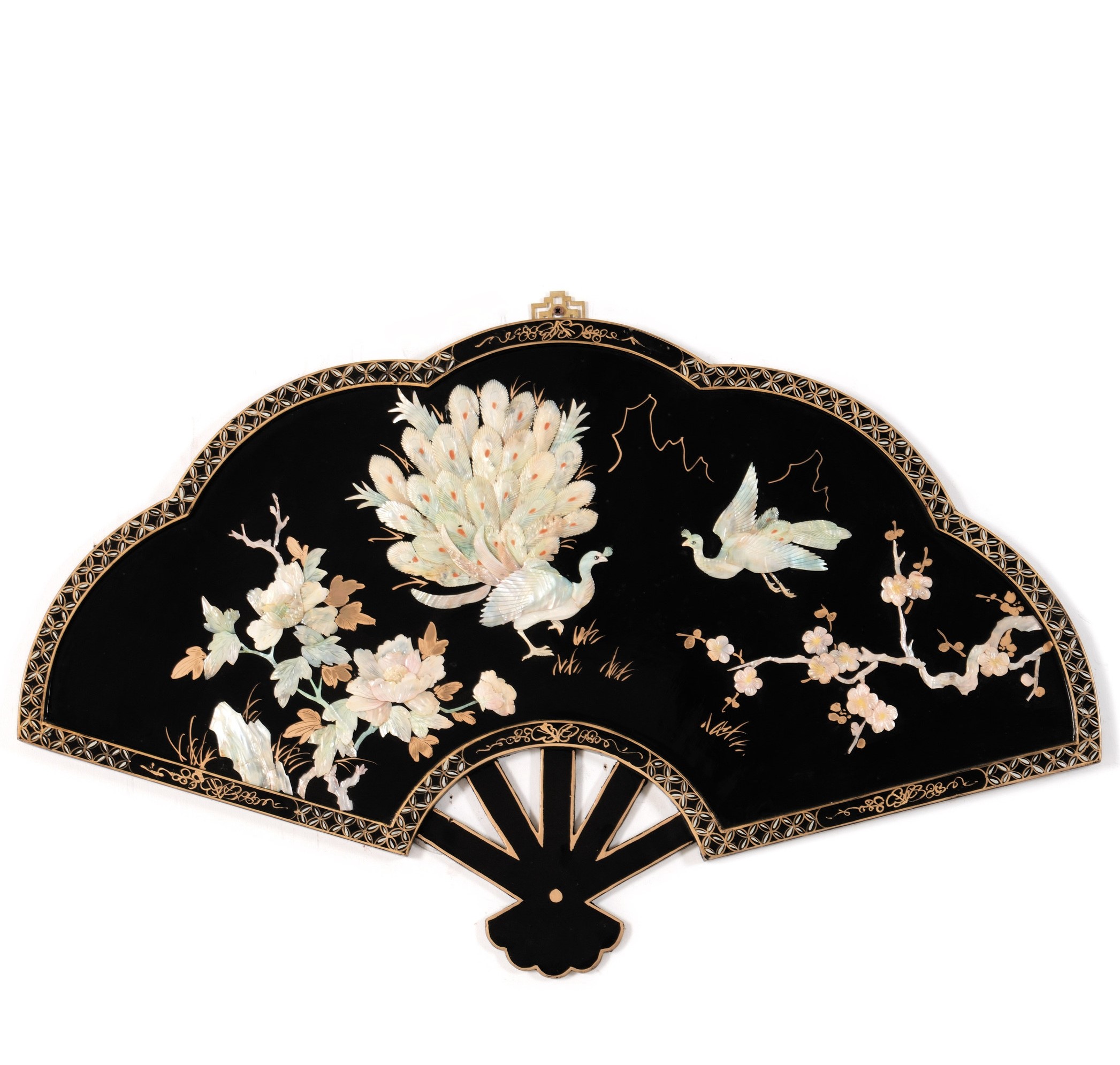 Grande pannello in legno a ventaglio con decori in madreperla