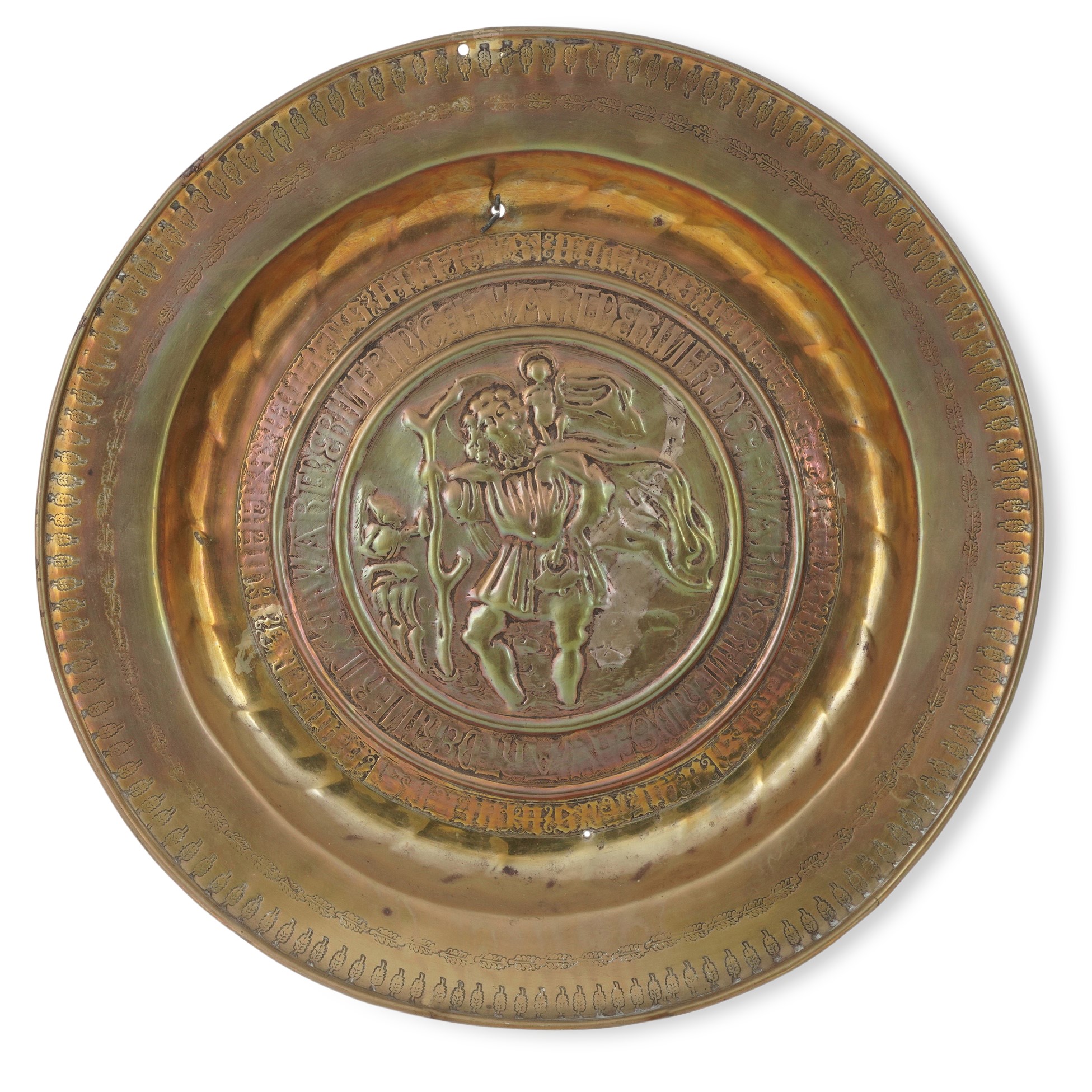 Piatto elemosiniere in ottone con San Cristoforo. Europa centro settentrionale, XVI secolo