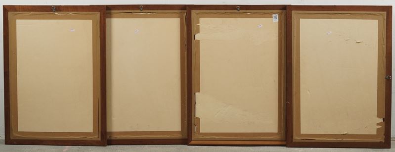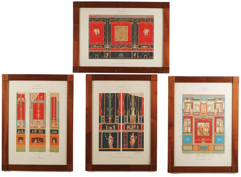 Quattro stampe moderne raffiguranti domus romane entro cornici in legno