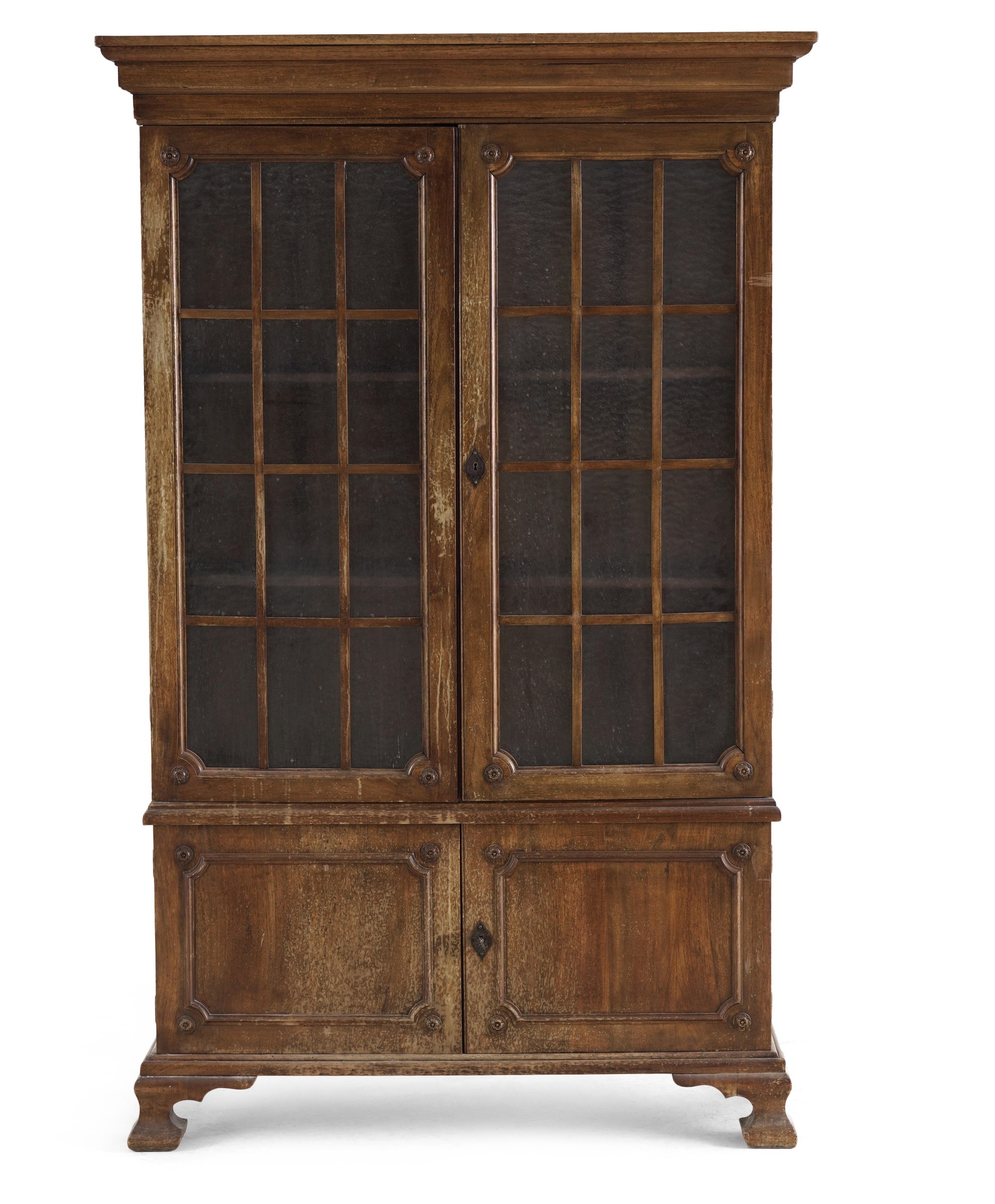 Parte inferiore a due ante formellate, parte superiore a due ante con vetri smerigliati