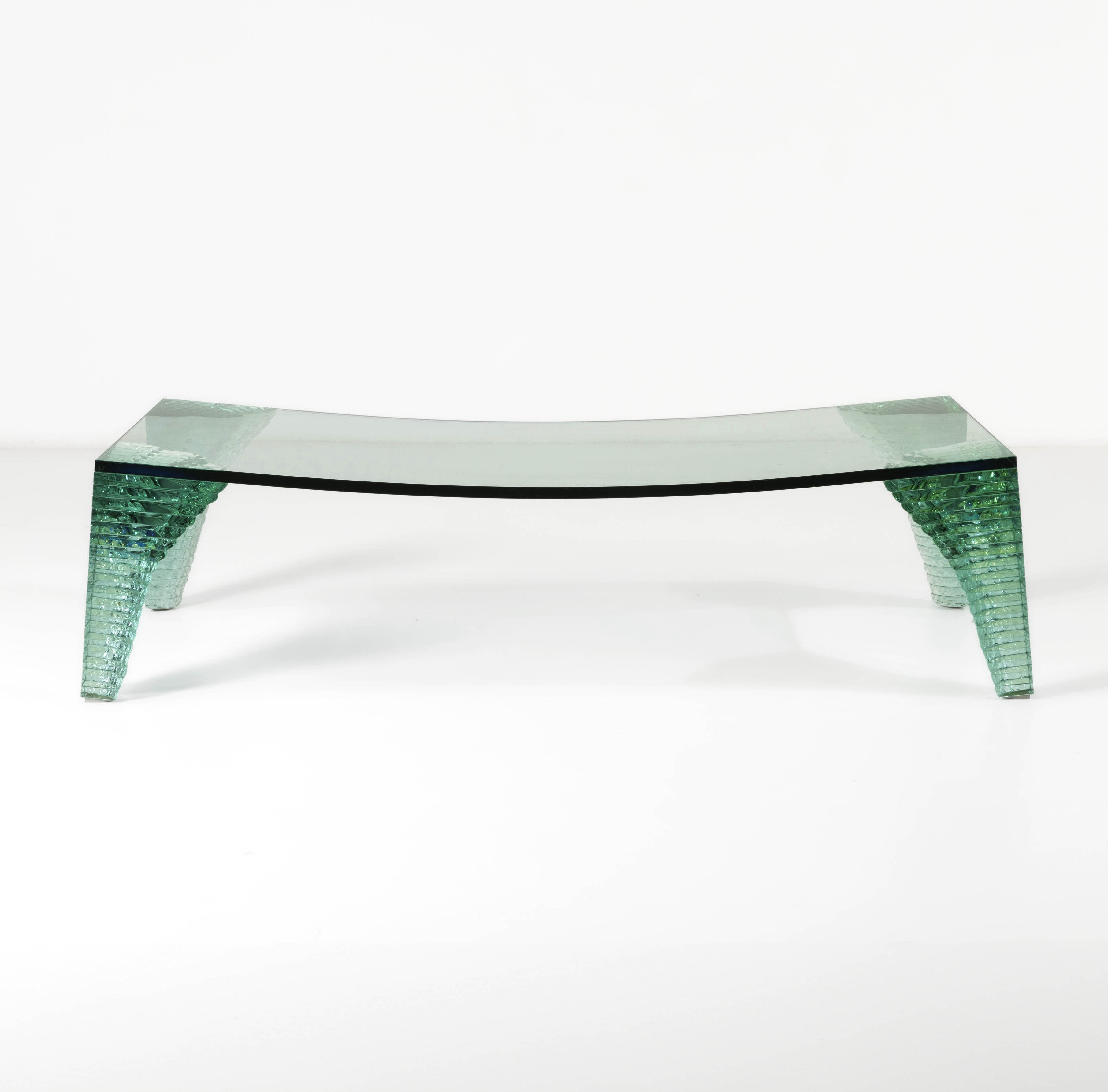 Sostegni in vetro scalpellato e piano in cristallo curvato.
