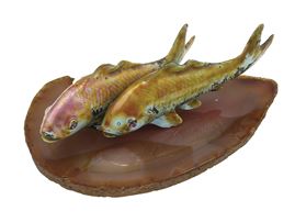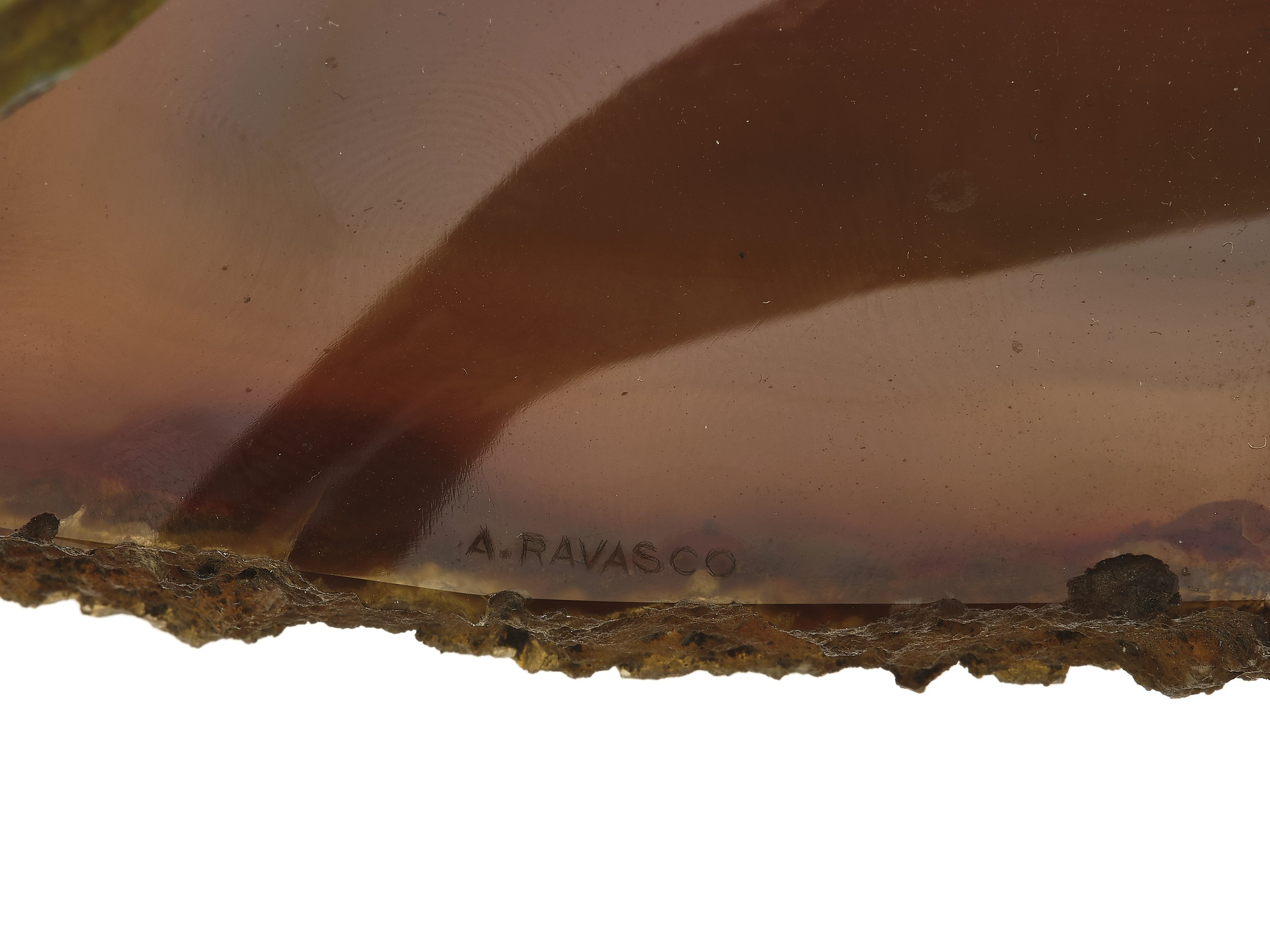 Alfredo Ravasco. Portaoggetti in agata con "carpe" in argento, smalti policromi e paste vitree