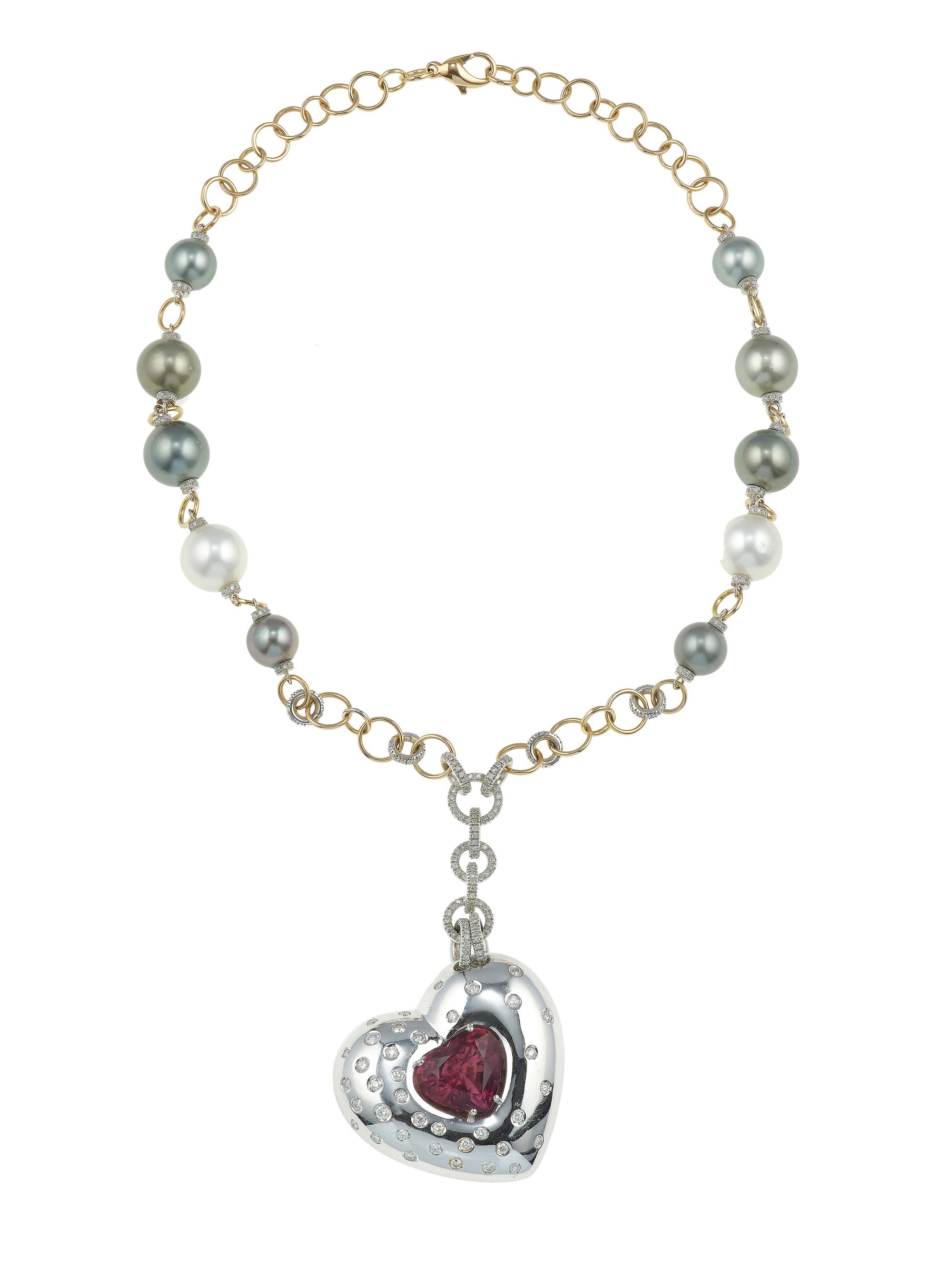 Girocollo con perle coltivate, diamanti e rubellite taglio cuore