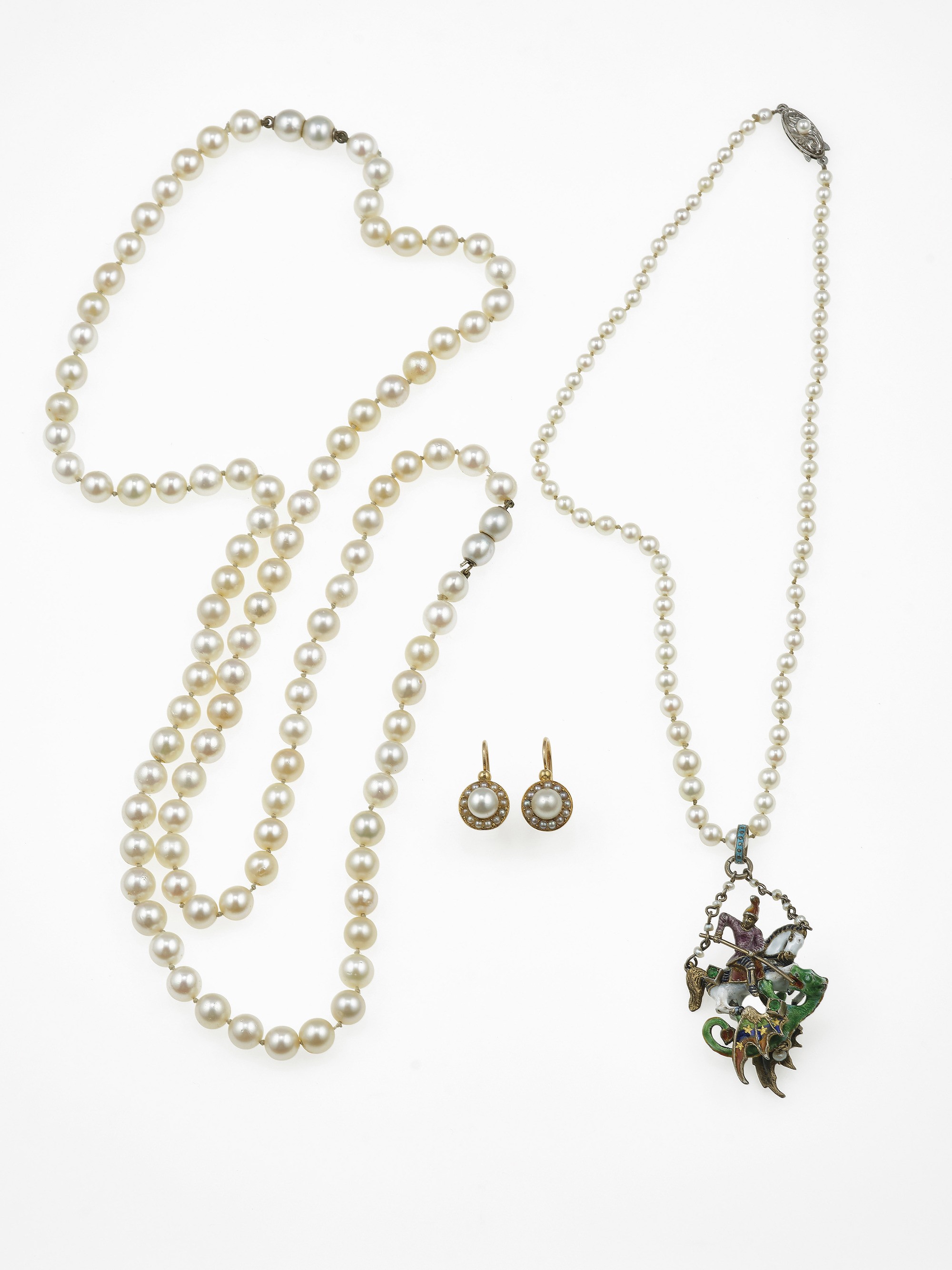 Lotto composto da due collane con perle, una con pendente in smalti policromi, ed un paio di orecchini