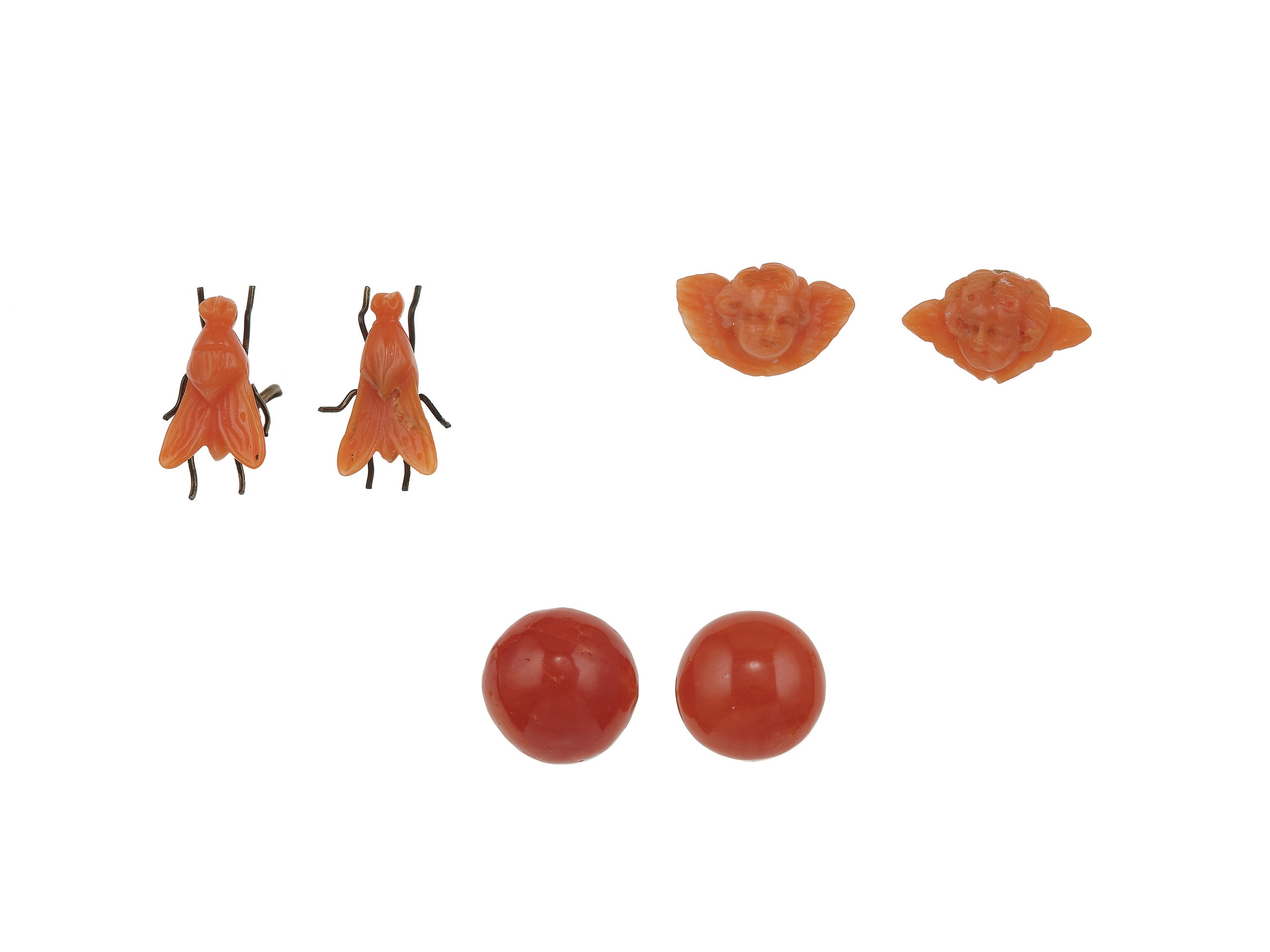 Lotto composto da una demi-parure "Pappagalli" composta da orecchini e pendente con corallo e piccole perle e tre paia di orecchini con corallo