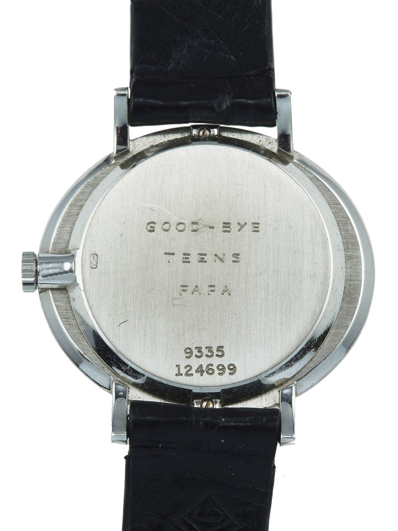 cassa in oro bianco 750/1000 con diamanti e cinturino in pelle. Numerato 9335 124699. Dedica incisa. Orologio non revisionato