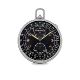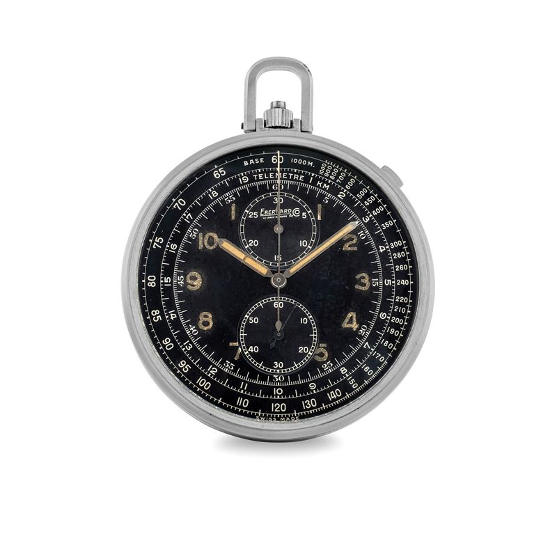 Cronografo da tasca con tasto a slitta Extrafort in acciaio con quadrante nero galvanico e contatori verticali, luminescenza al radio, circa 1950