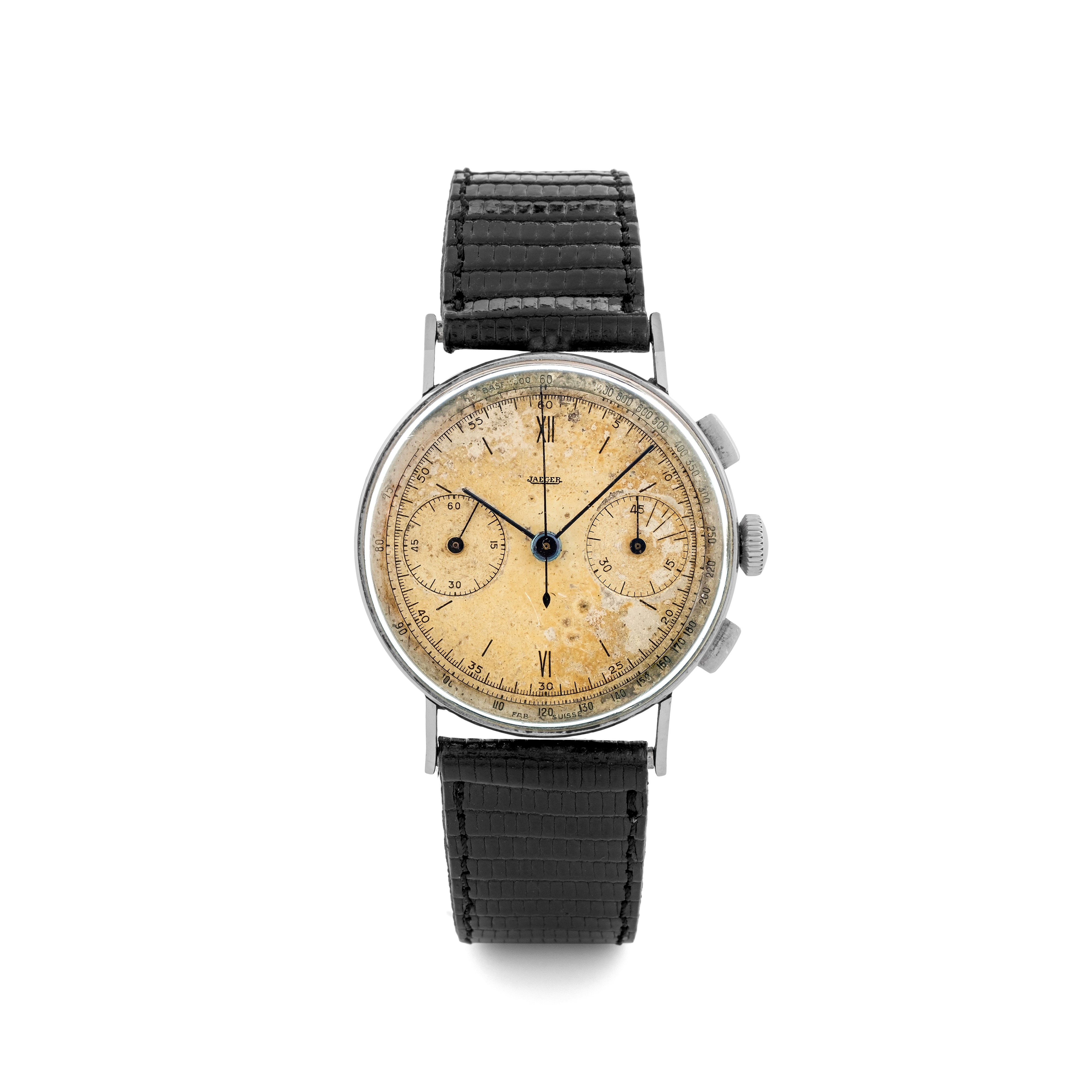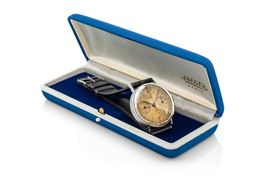Cronografo due contatori tasti quadri in acciaio carica manuale, con scatola, circa 1930