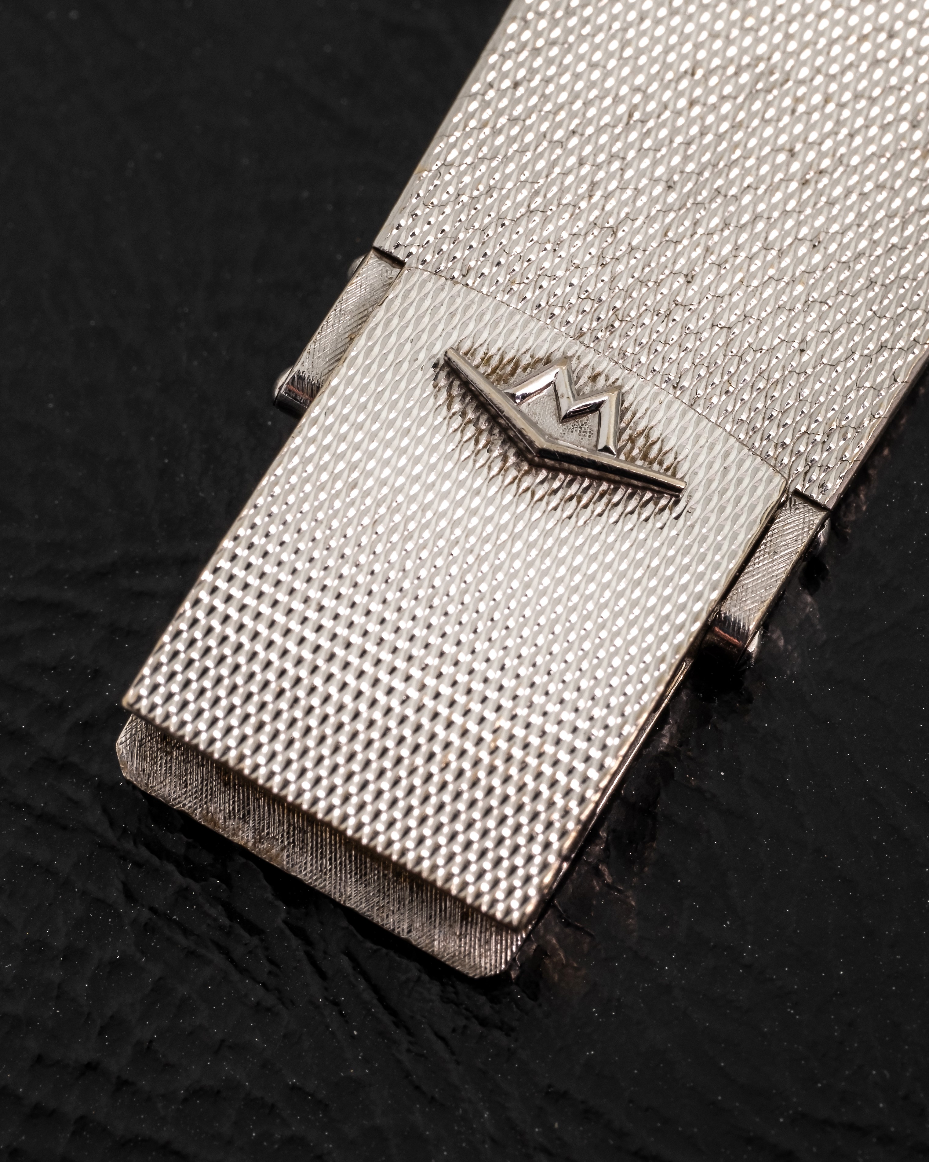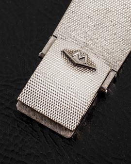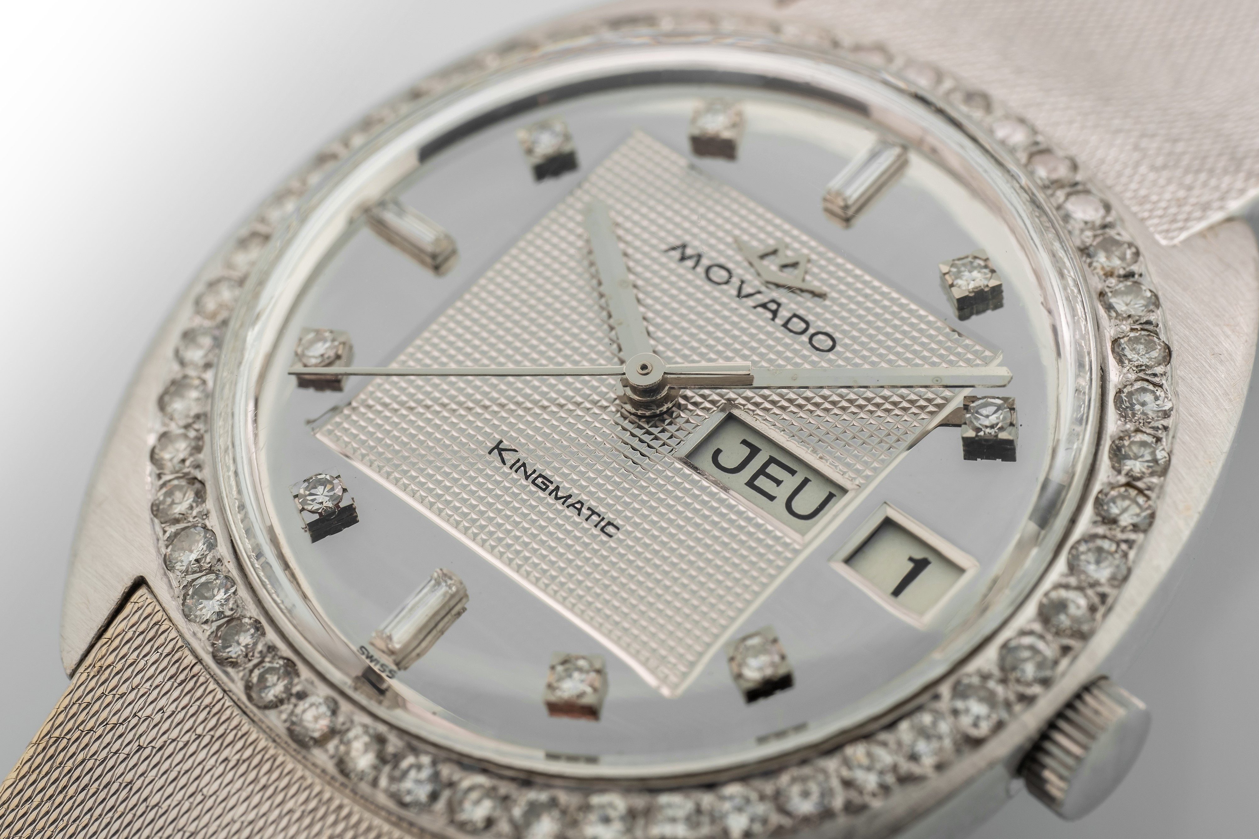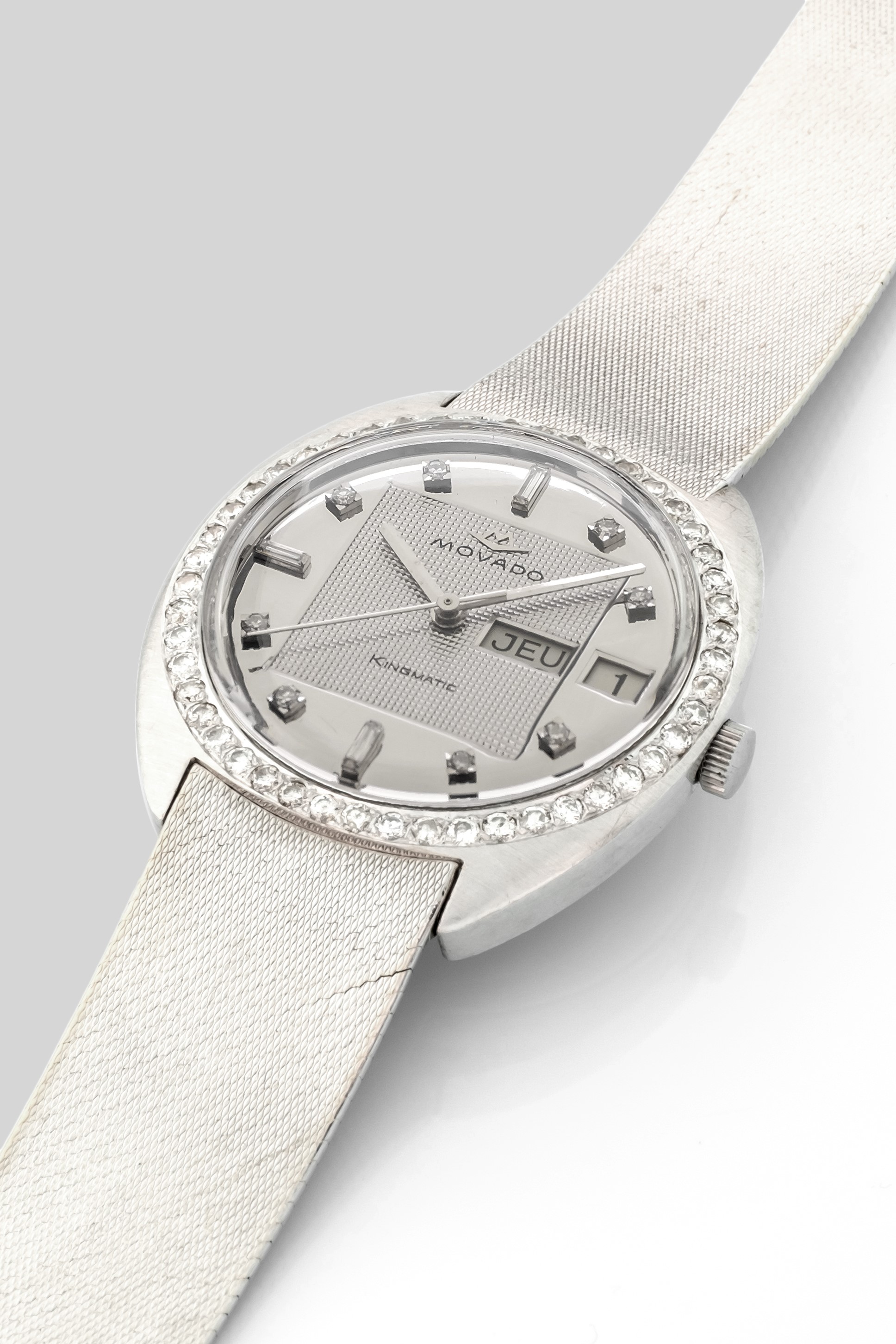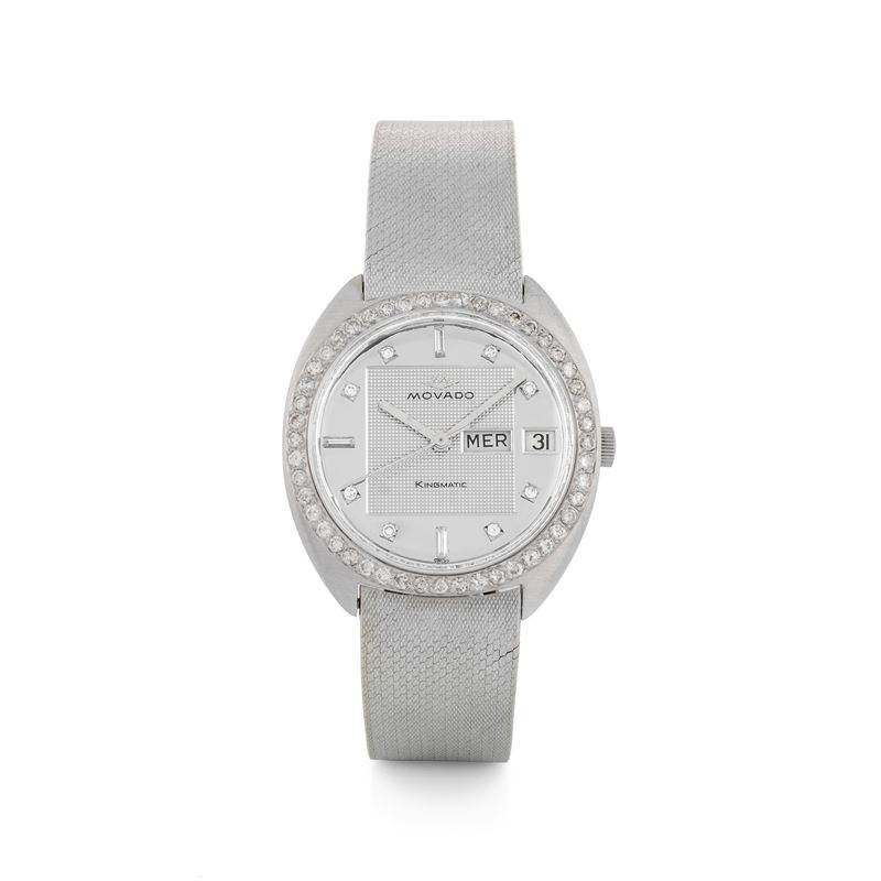 King Matic in oro bianco 18k con quadrante specchiato e ghiera con diamanti, circa 1950