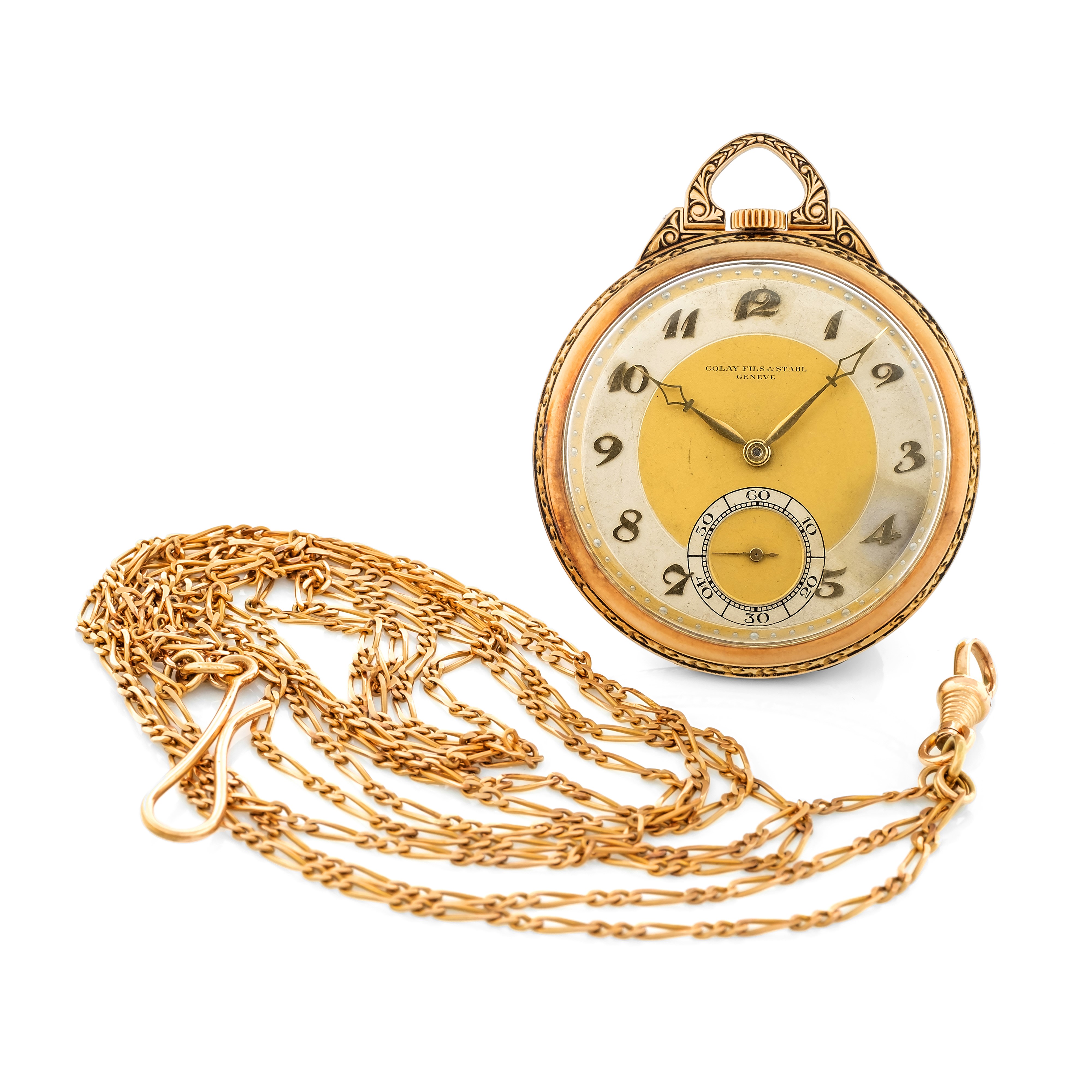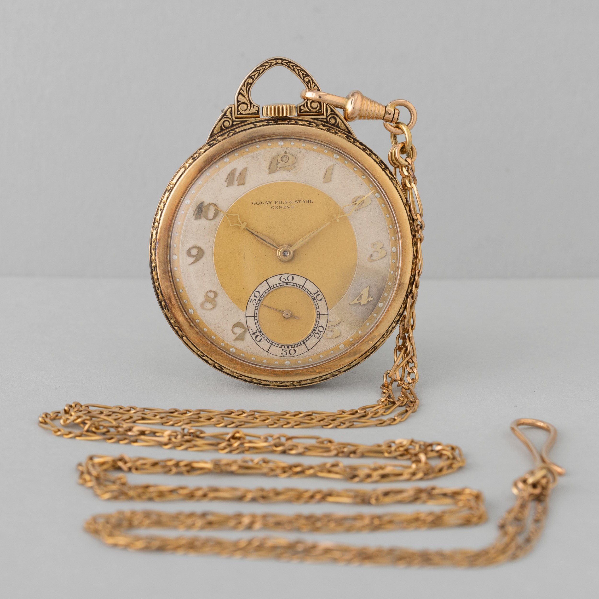 Tasca personalizzato "Golay Fils & Sthal" in oro giallo 14k, quadrante bitonale numeri Breguet, cassa cesellata a mano, circa 1920