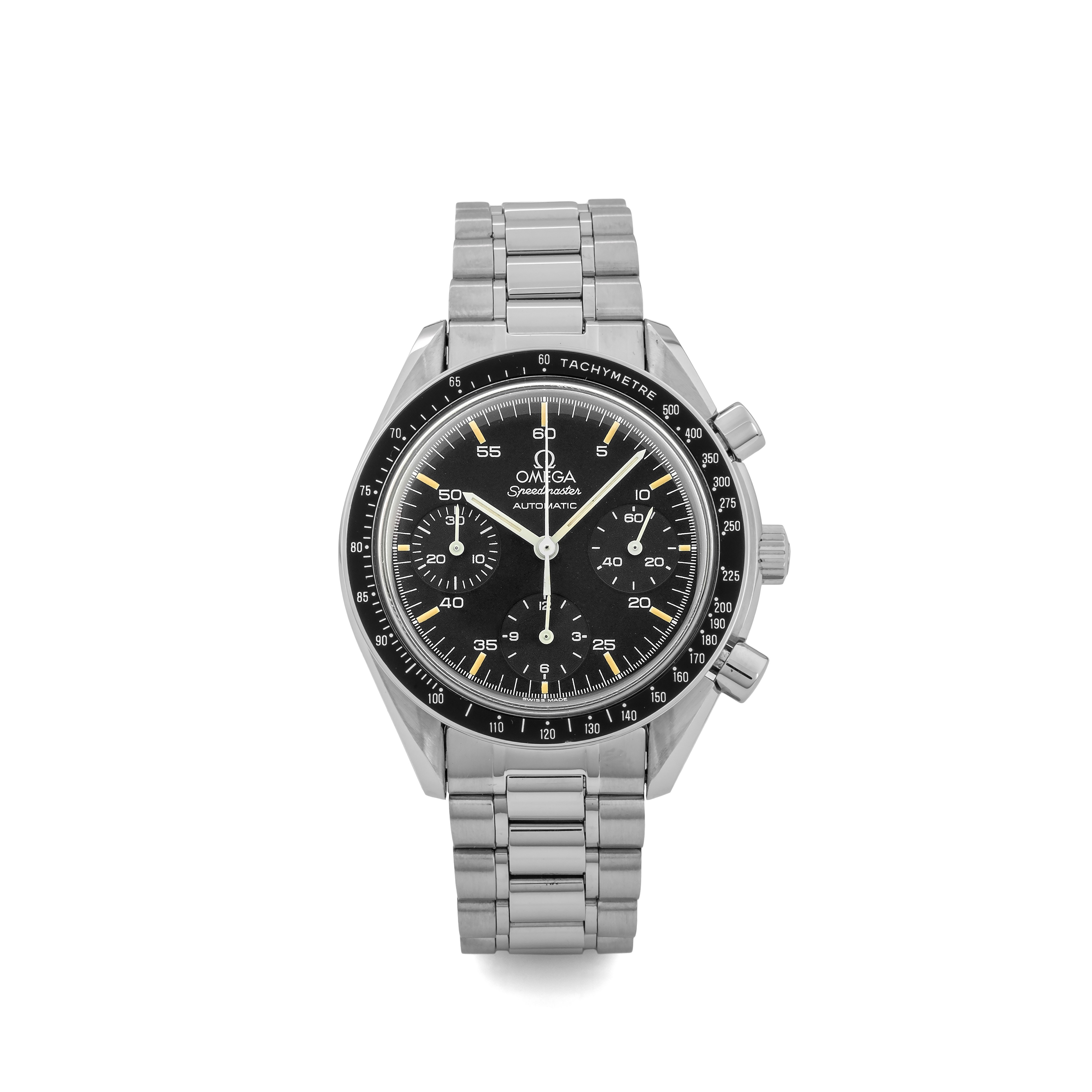 Speedmaster Reduced automatico in acciaio, quadrante nero al trizio, circa 1998