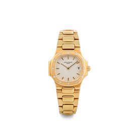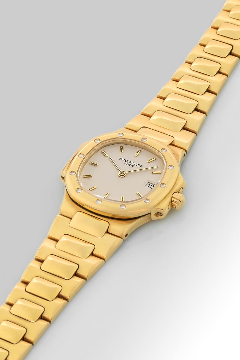 Nautilus Lady ref. 4700 in oro giallo 18k con diamanti sulla ghiera, scatola e garanzia, circa 1986