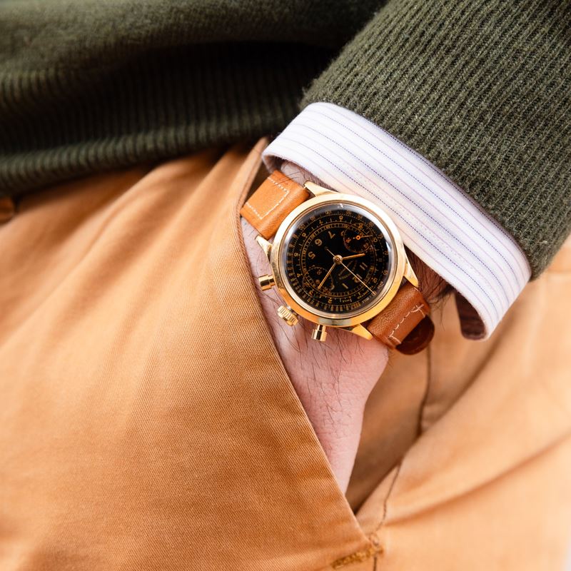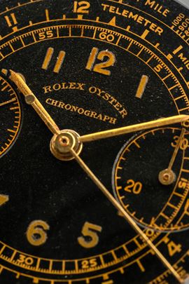 Cronografo Oyster "Barilotto" ref 3525 in oro giallo 18k quadrante nero grafica oro, circa 1942