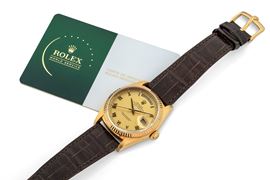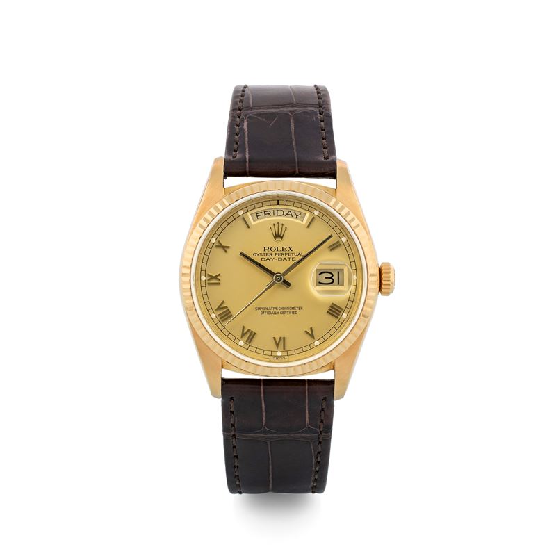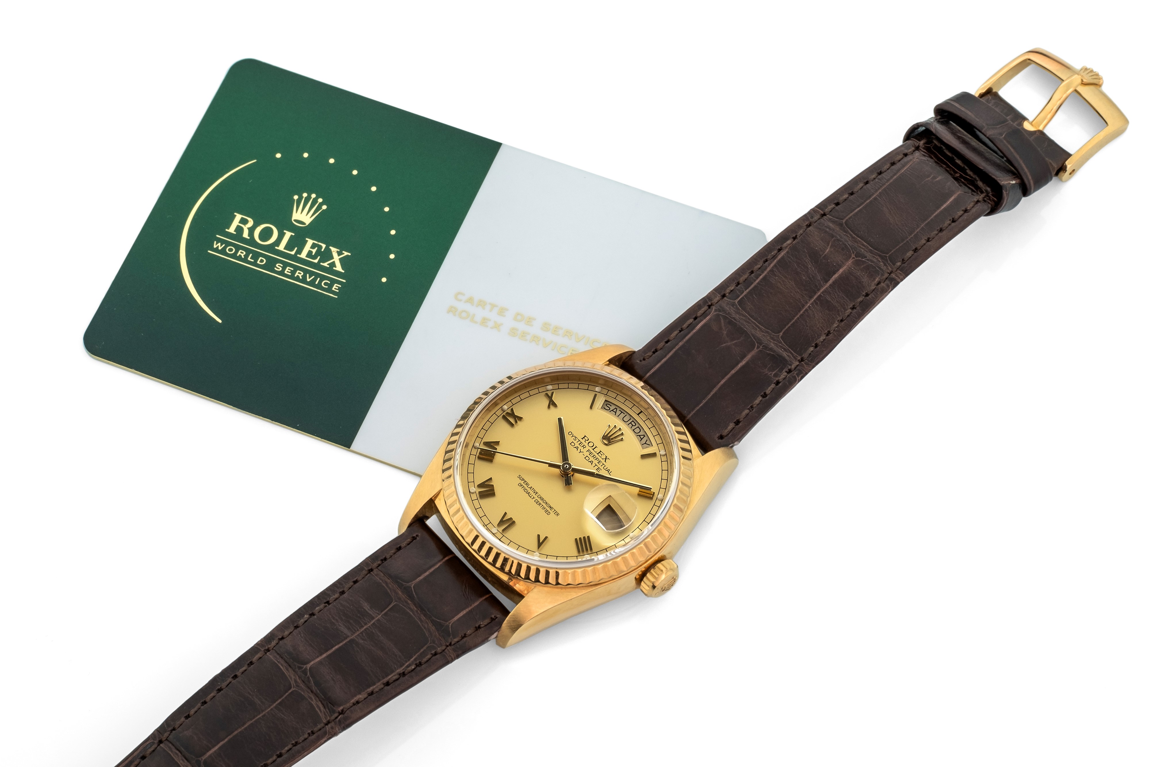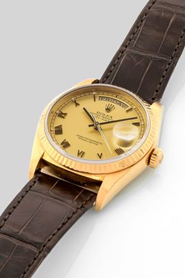 Day-Date ref 18038 in oro giallo 18k, quadrante Champagne con numeri Romani applicati, circa 1986