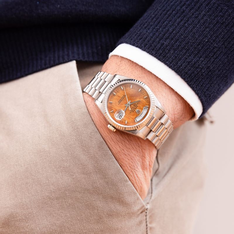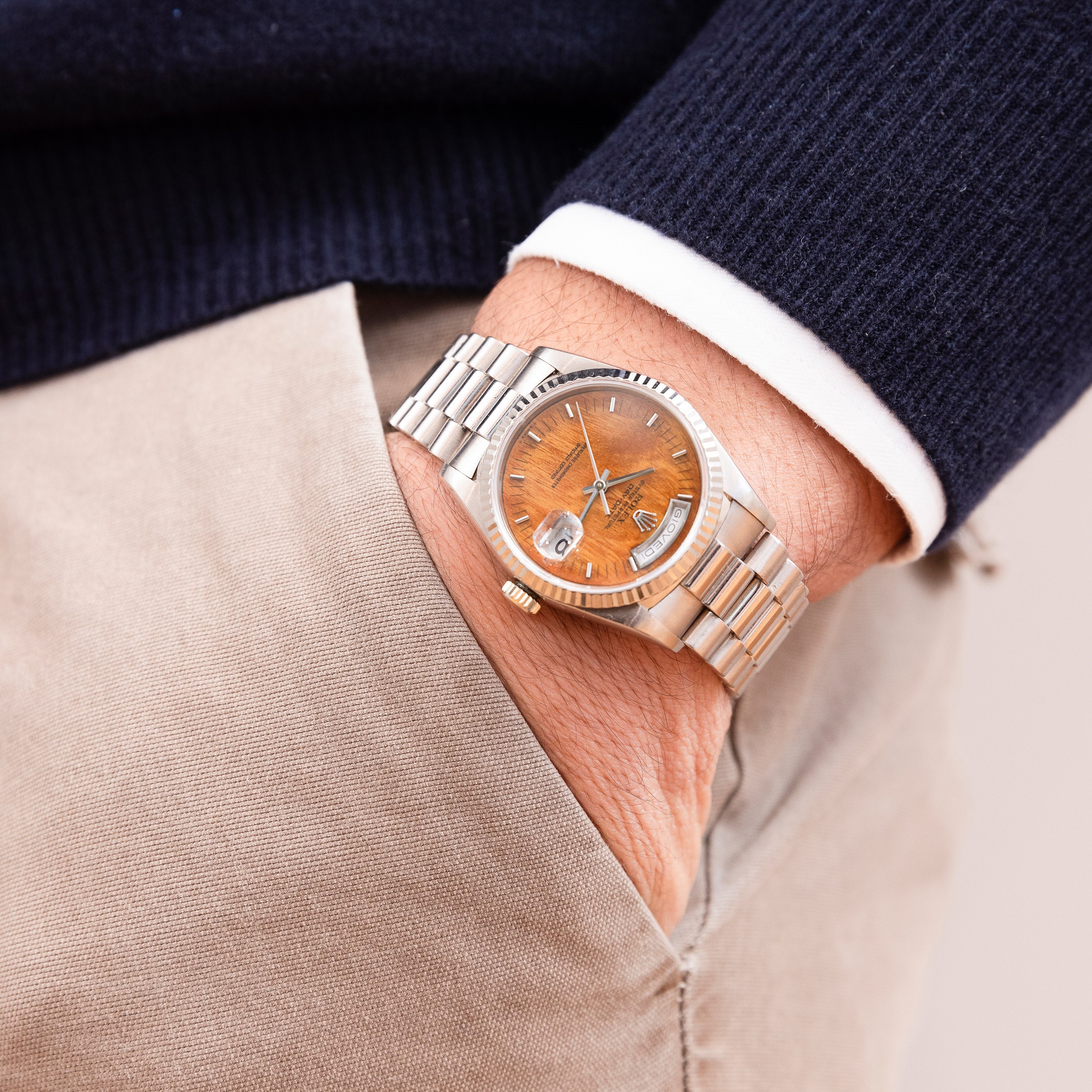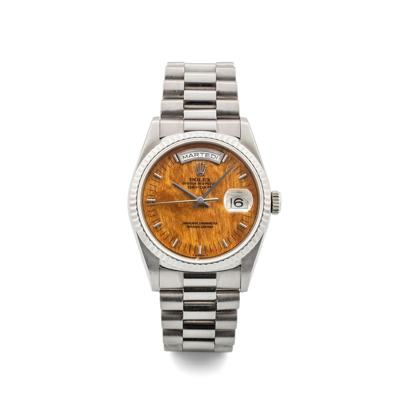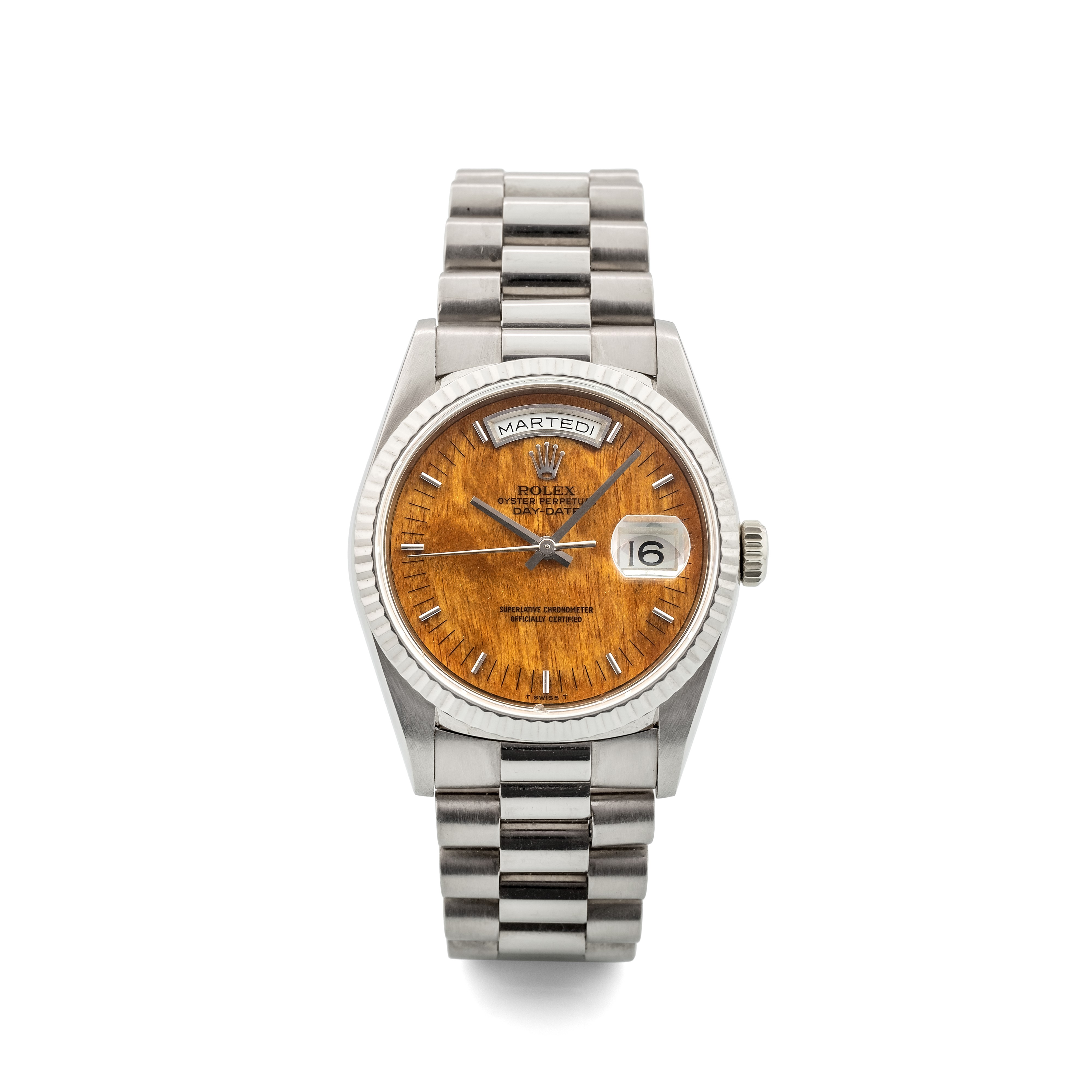 Daydate ref 18239 oro bianco 18k quadrante in Radica con garanzia originale, circa 1997