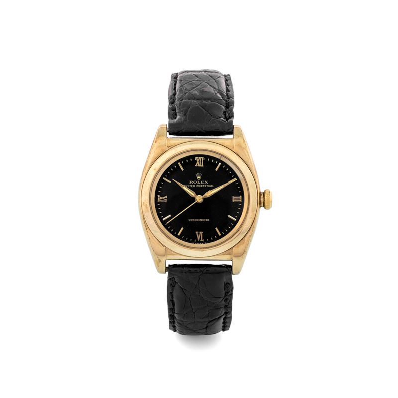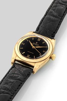Ovetto ref 3131 in oro giallo 18k, quadrante nero Gilt secondi centrali, circa 1947