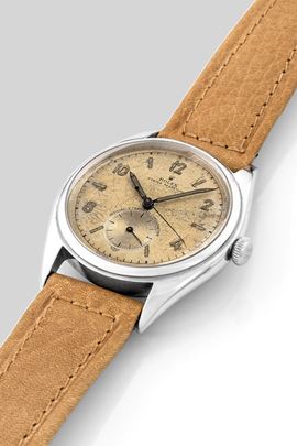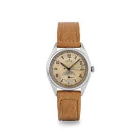 Raro Ovettone ref 5028/6 in acciaio con doppi secondi al centro e al sei, circa 1945