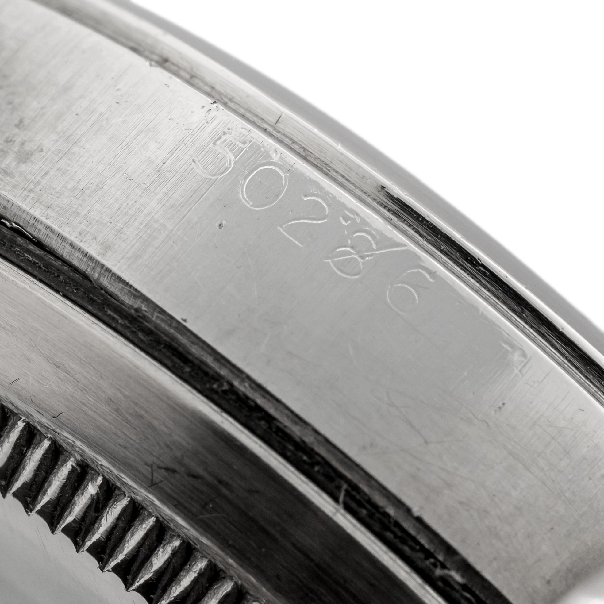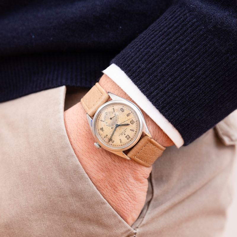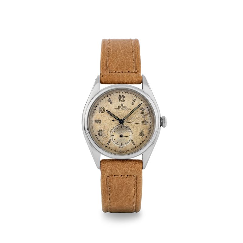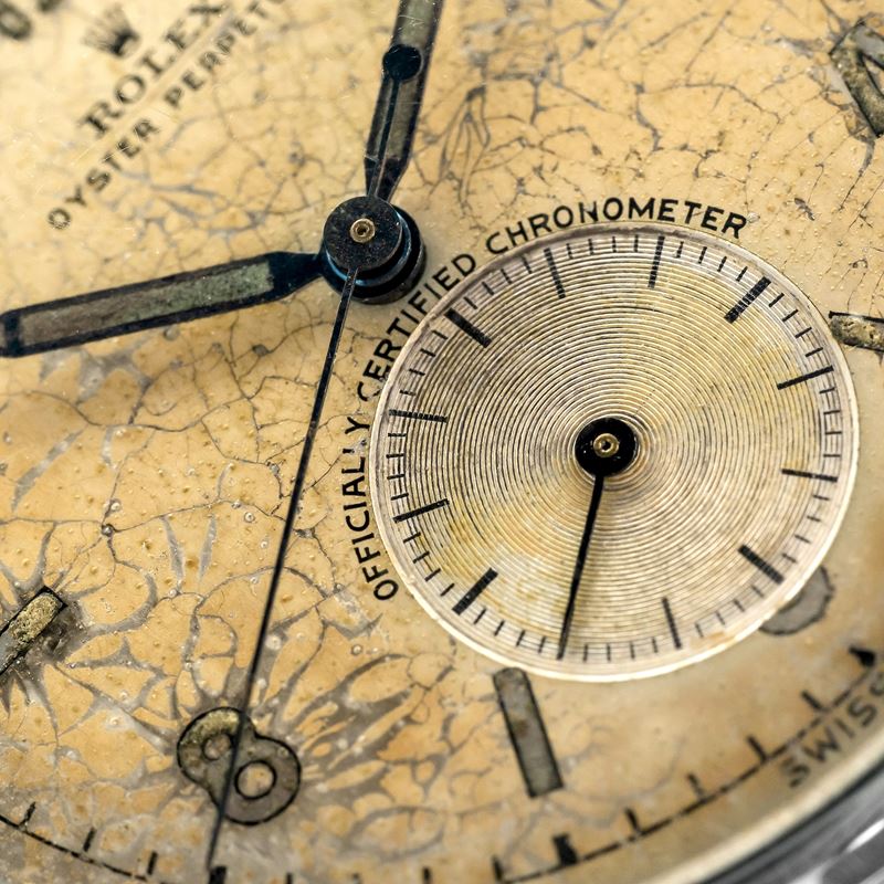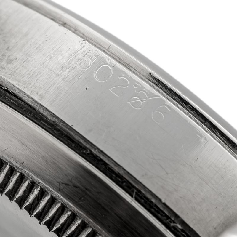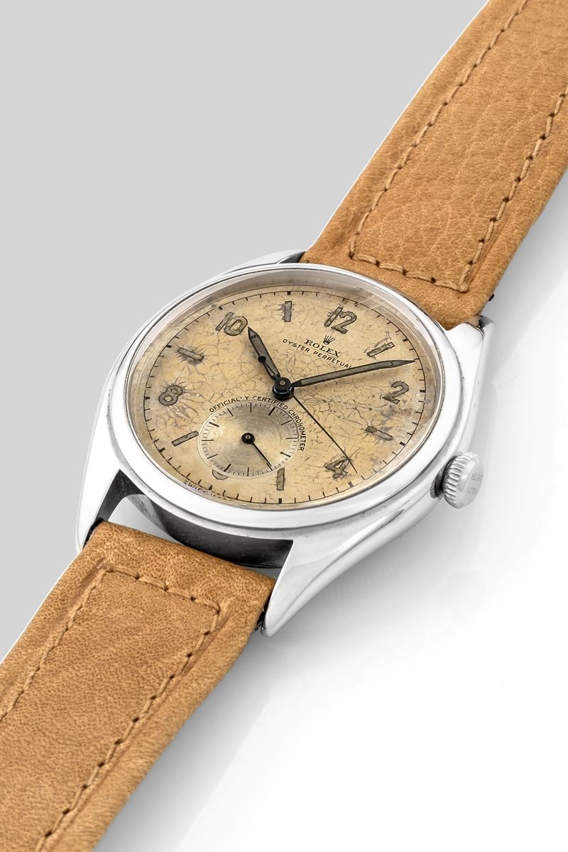 Questo rarissimo Ovettone in acciaio ha una caratteristica davvero rara ed inusuale ovvero la presenza dell’indicazione sia al centro che in basso. Questa caratteristica difficilmente spiegabile è però confermata dalla presenza di una doppia referenza incisa sulla cassa. La referenza 5028 infatti è nota per essere dotata di secondi centrali mentre la referenza 5026 è equipaggiata da un piccolo contatore dei secondi ad ore sei. In questo caso specifico invece si può notare che la referenza scritta sulla cassa 5028 è barrata ed è stato aggiunto un 6 come a significare che era una referenza ibrida. Probabilmente un esperimento di casa Rolex o forse un prototipo è sicuramente un raro orologio da collezione.