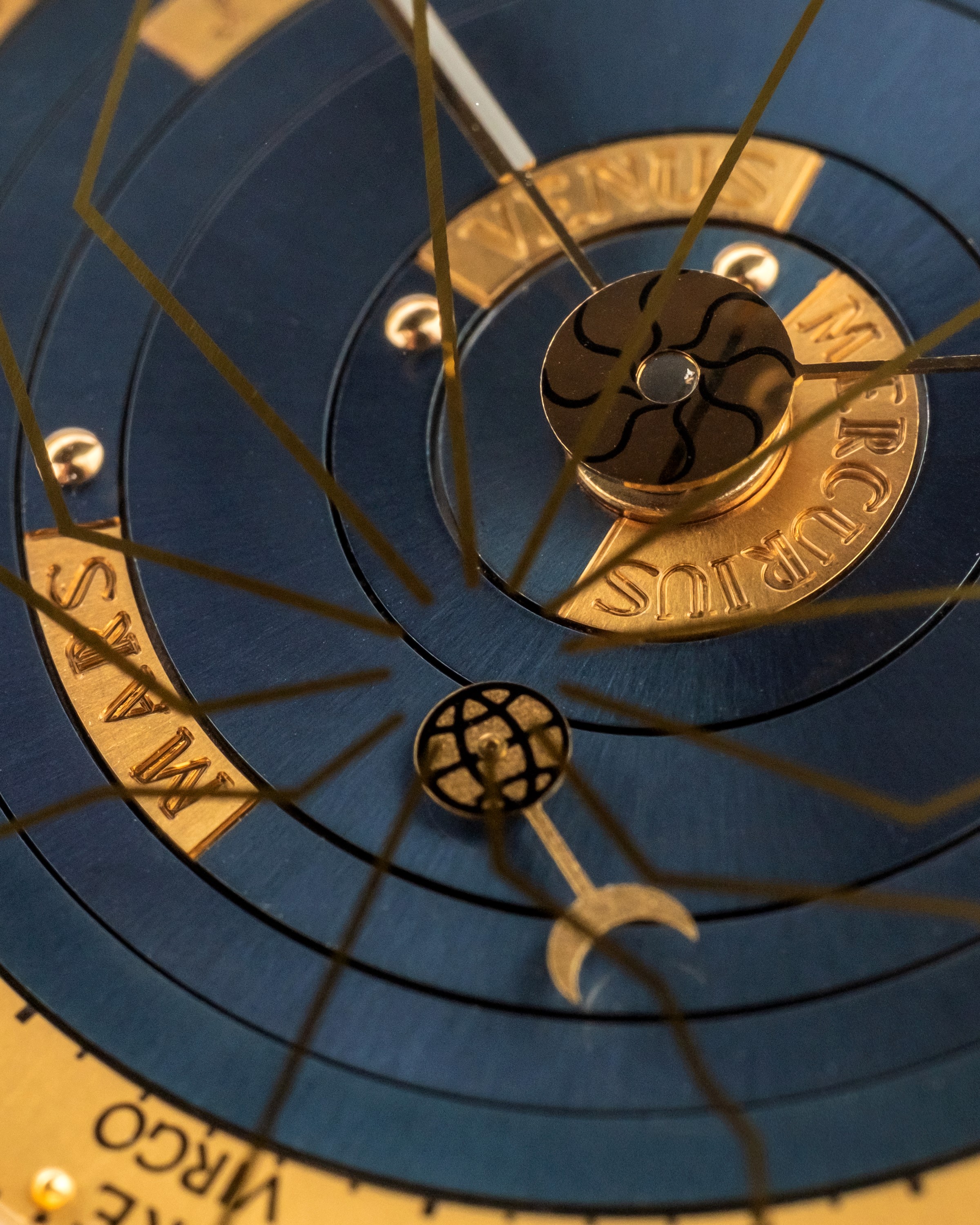 Oltre alla funzione di misurazione del tempo, il quadrante è segmentato in diversi quadranti concentrici che ruotano, rappresentando sia l'universo terrestre-centrico di Tolomeo sia l'universo elio-centrico di Copernico.