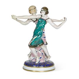 Gruppo in porcellana raffigurante danzatrici abbracciate con decoro di smalti policromi e filettature in oro.
