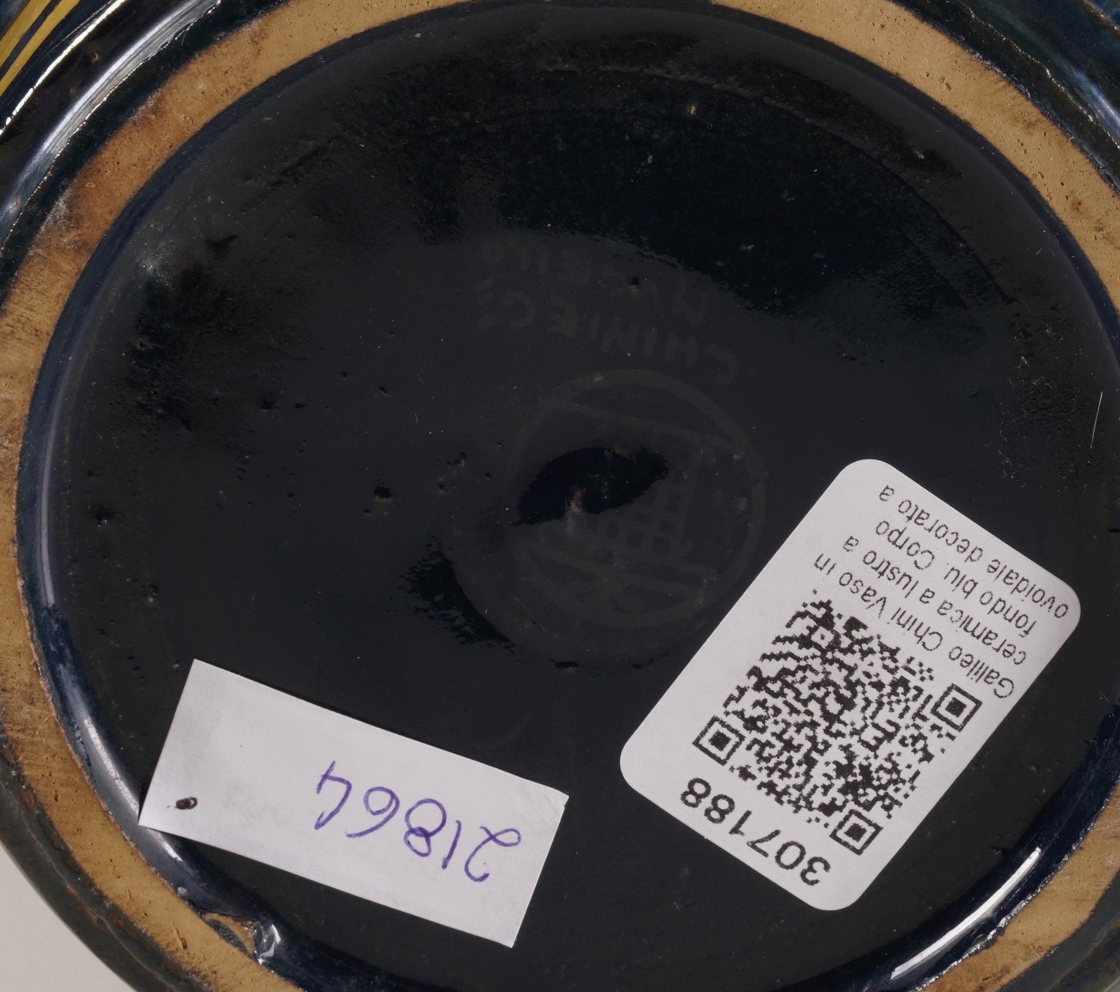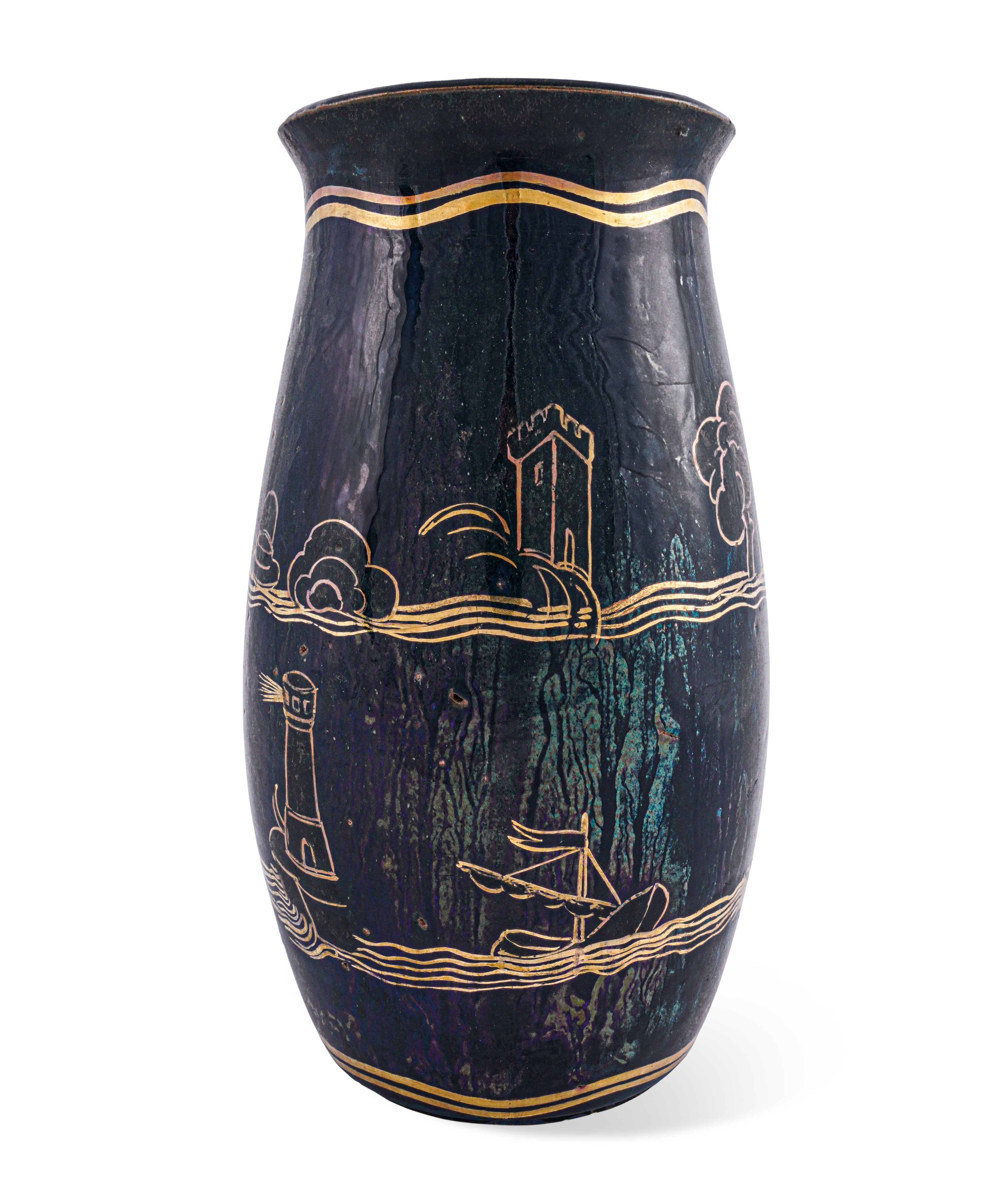 Vaso in ceramica a fondo monocromo scuro con decoro di architetture e paesaggio marino a filettature d'oro.