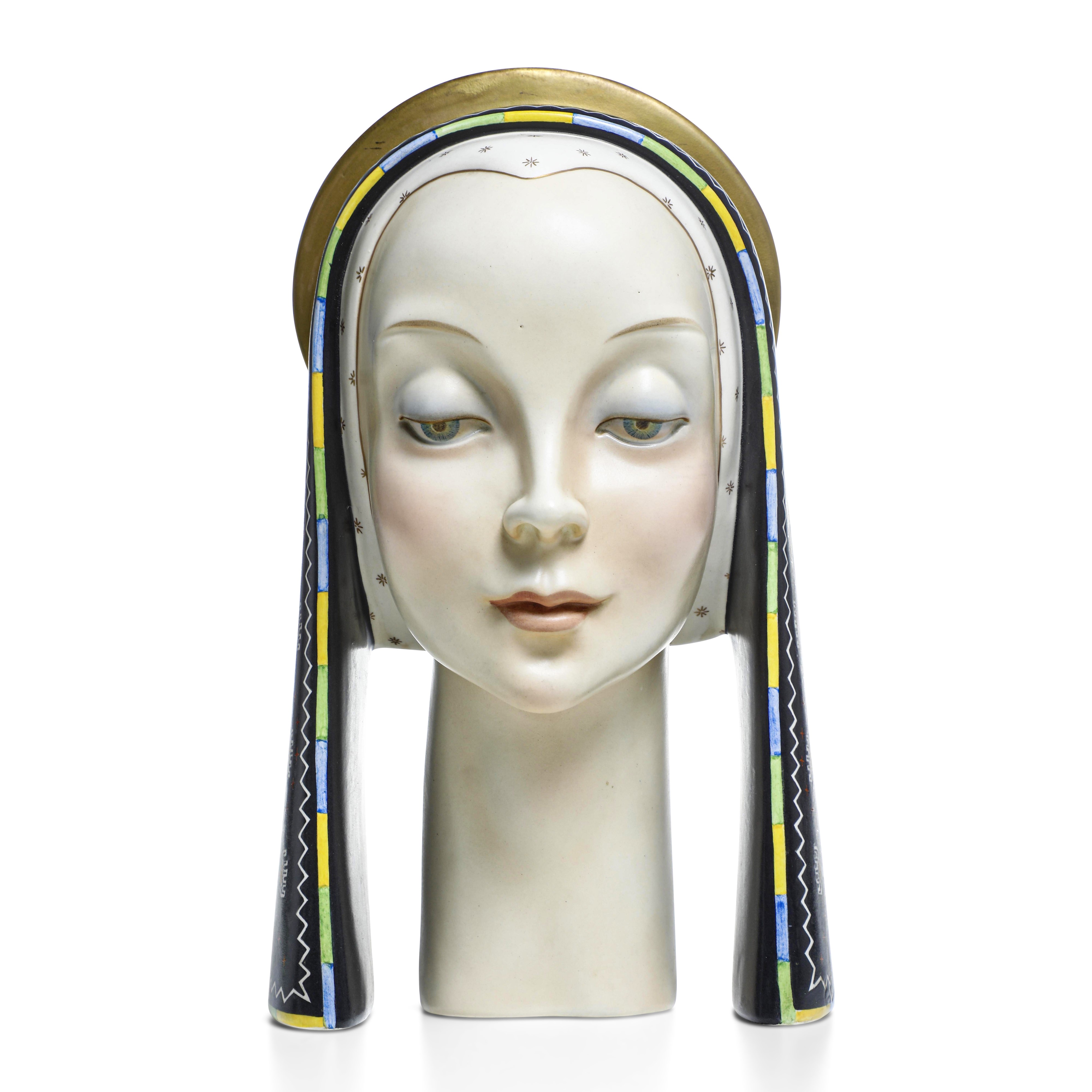Testa su alto collo con aureola e lungo velo stilizzato in terraglia a colaggio con decoro policromo.