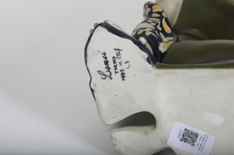 Figura di donna con orcio in terraglia a colaggio con decoro policromo.