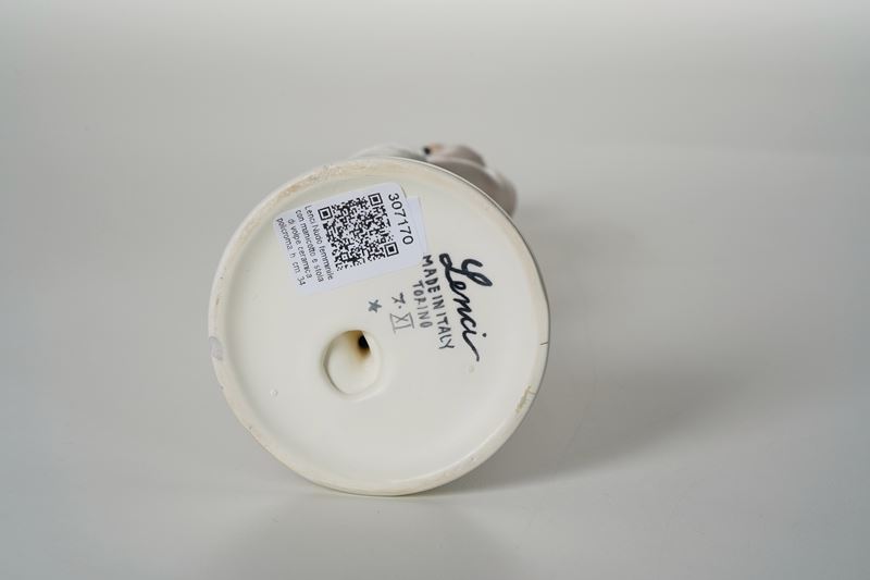 Figura femminile con manicotto e sciarpa in pelliccia in terraglia a colaggio con leggero decoro policromo.