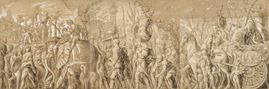 Il soggetto replica quello di tre delle nove tele dipinte da Mantegna tra il 1485 circa e il 1505 e conservate a Hampton Court a Londra