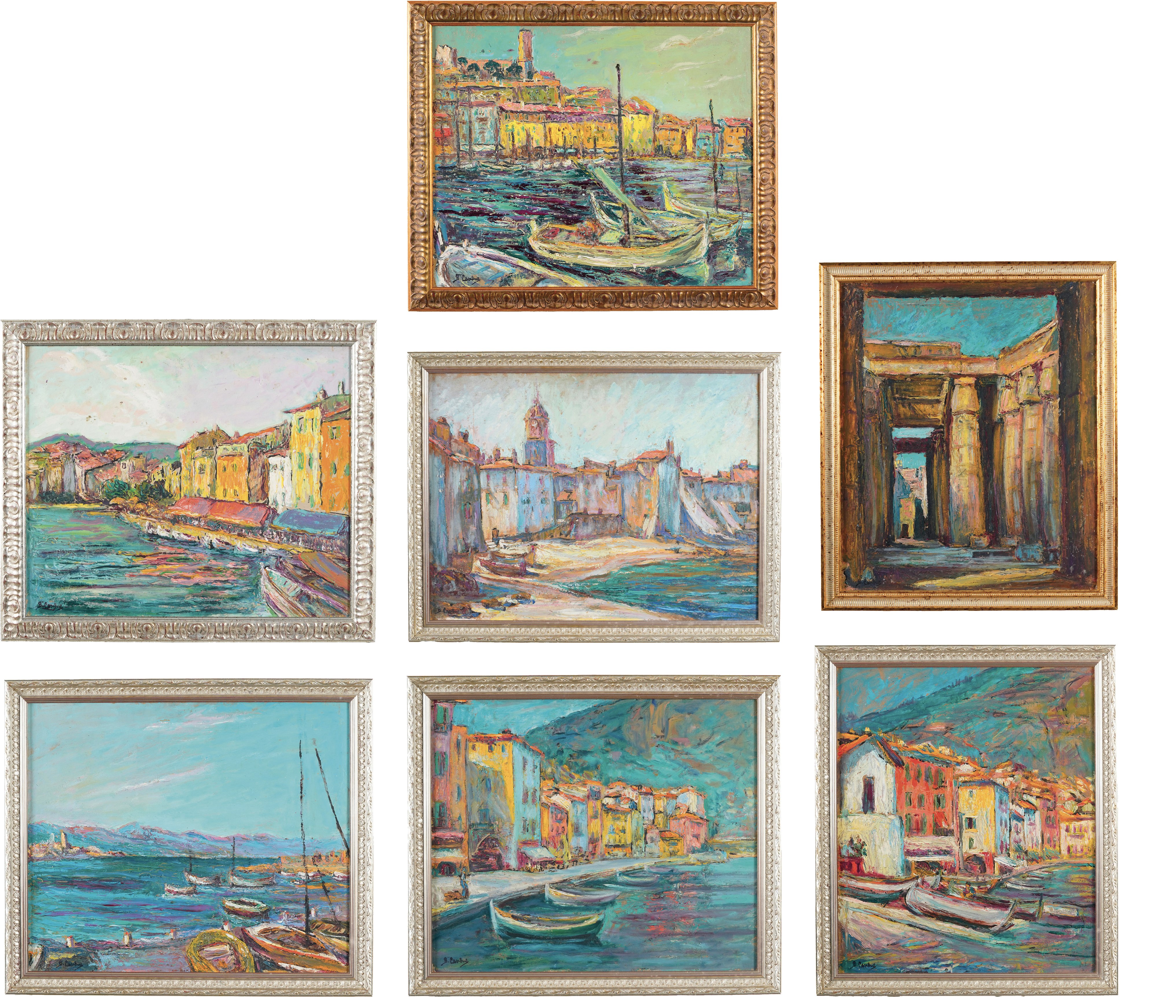 Insieme di sette dipinti ad olio su tela