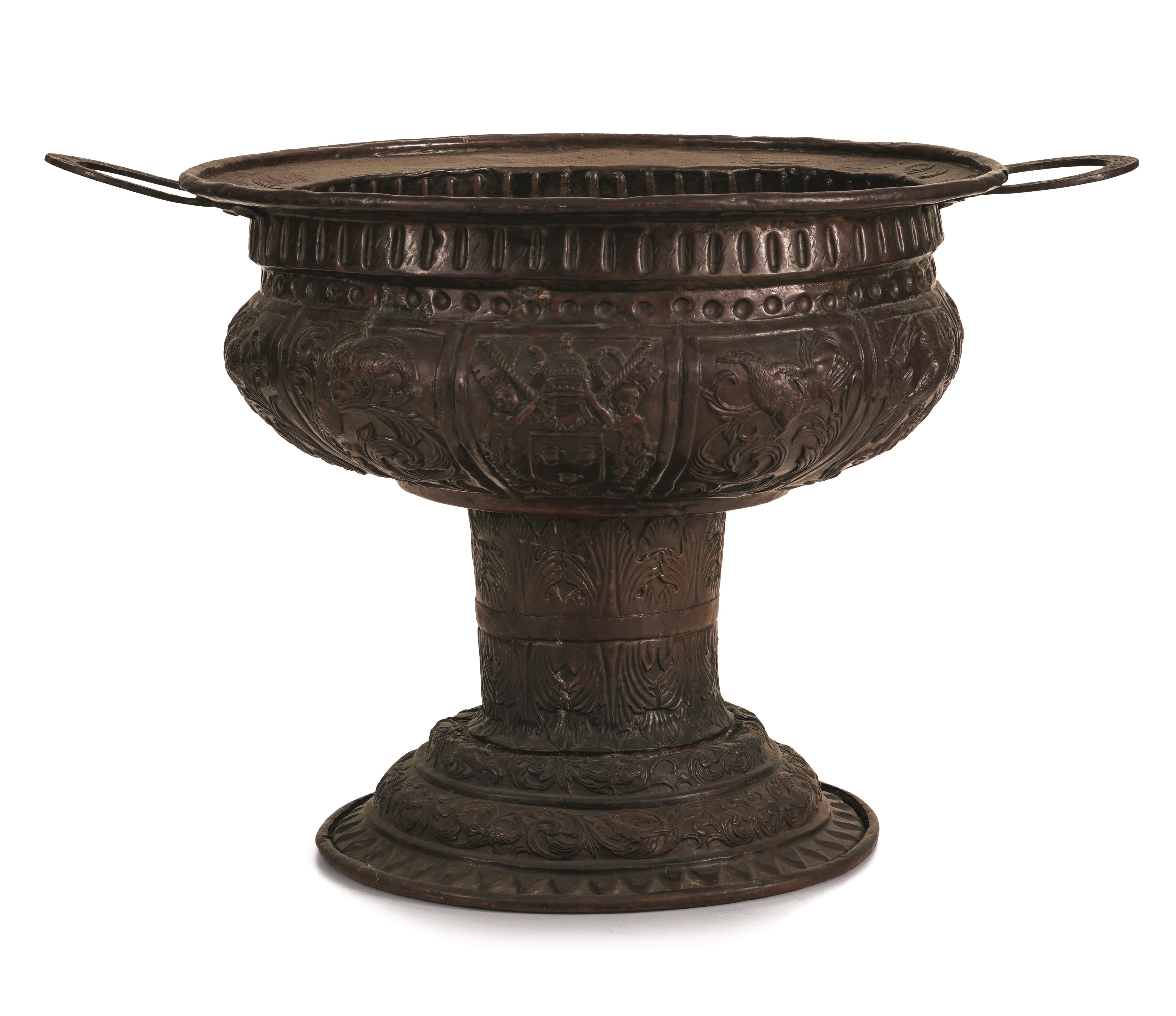 a foggia di coppa biansata, decori vegetali e zoomorfi, al centro stemma papale probabilmente di Innocenzo XII Pignatelli
