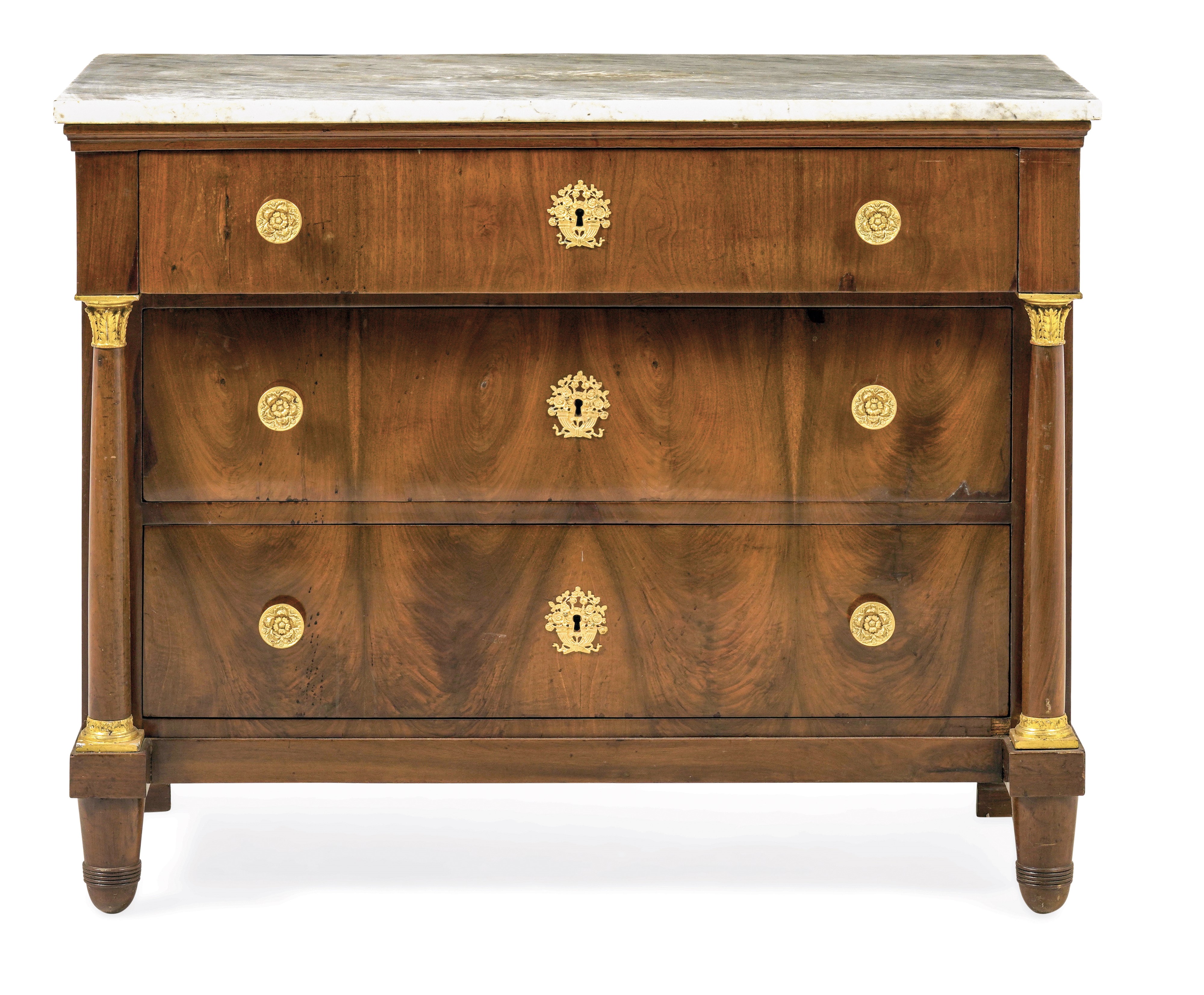 tre cassetti sul fronte, montanti a colonna con basi e capitelli in bronzo dorato, piano in marmo bianco