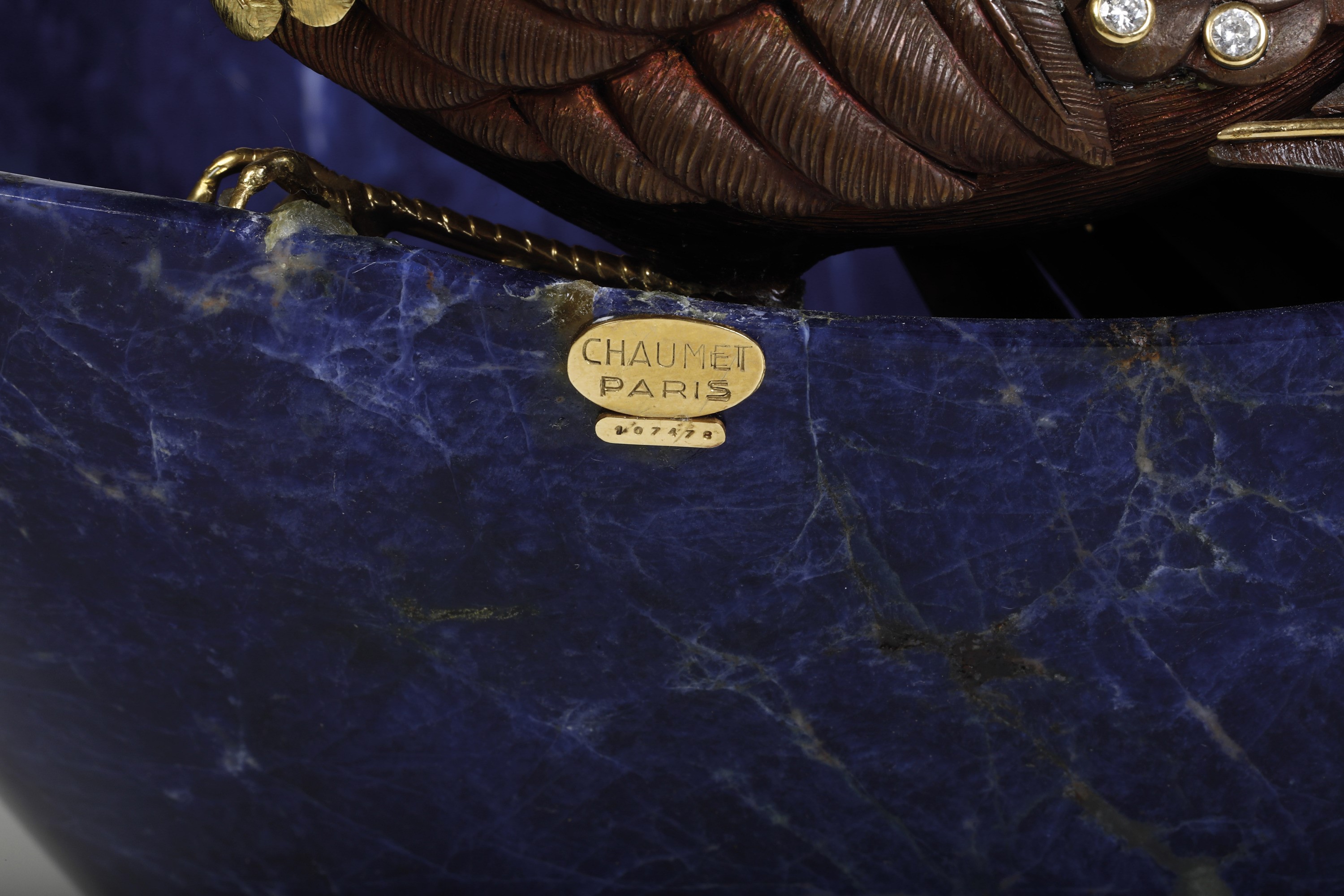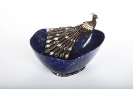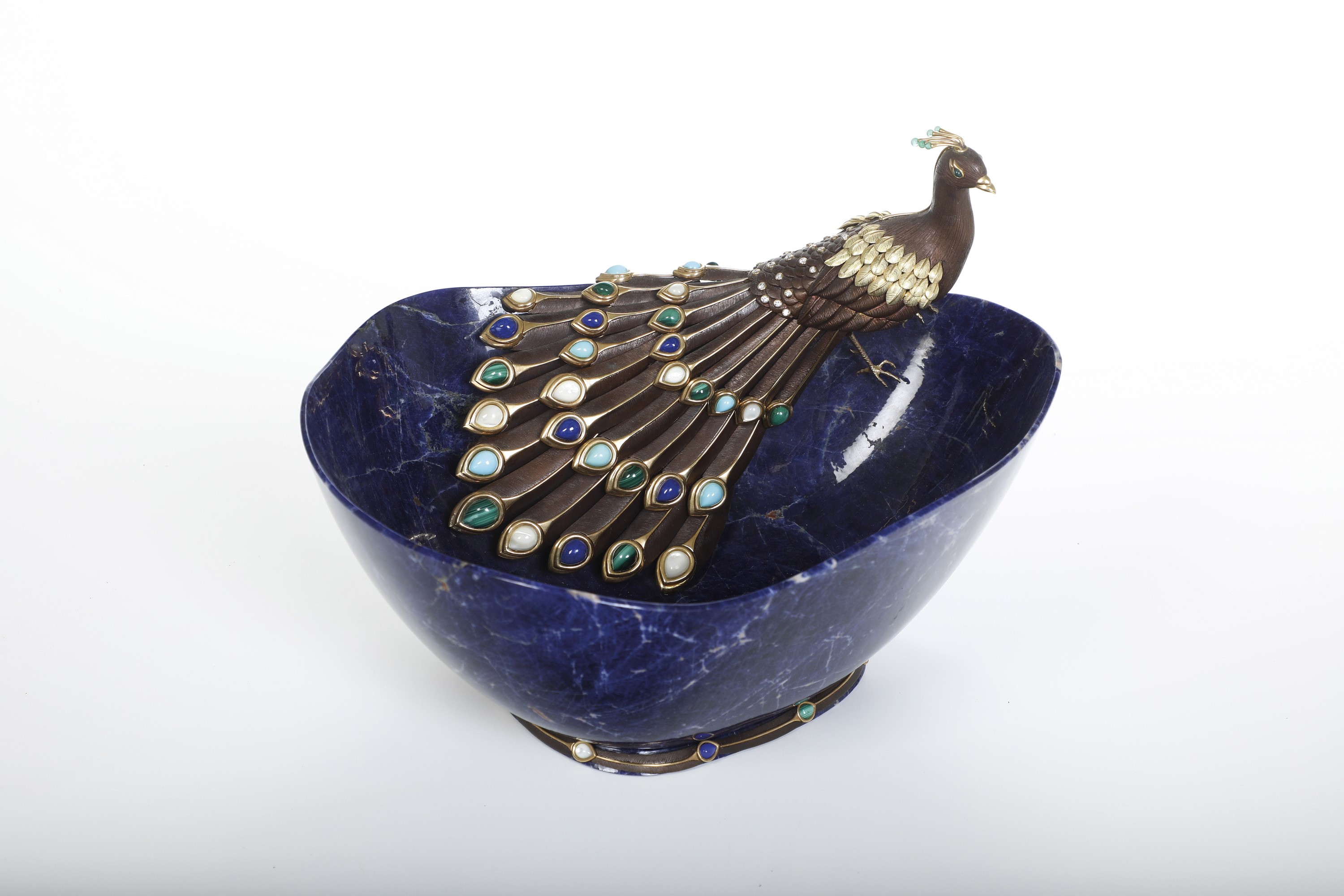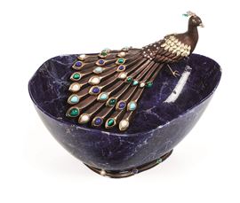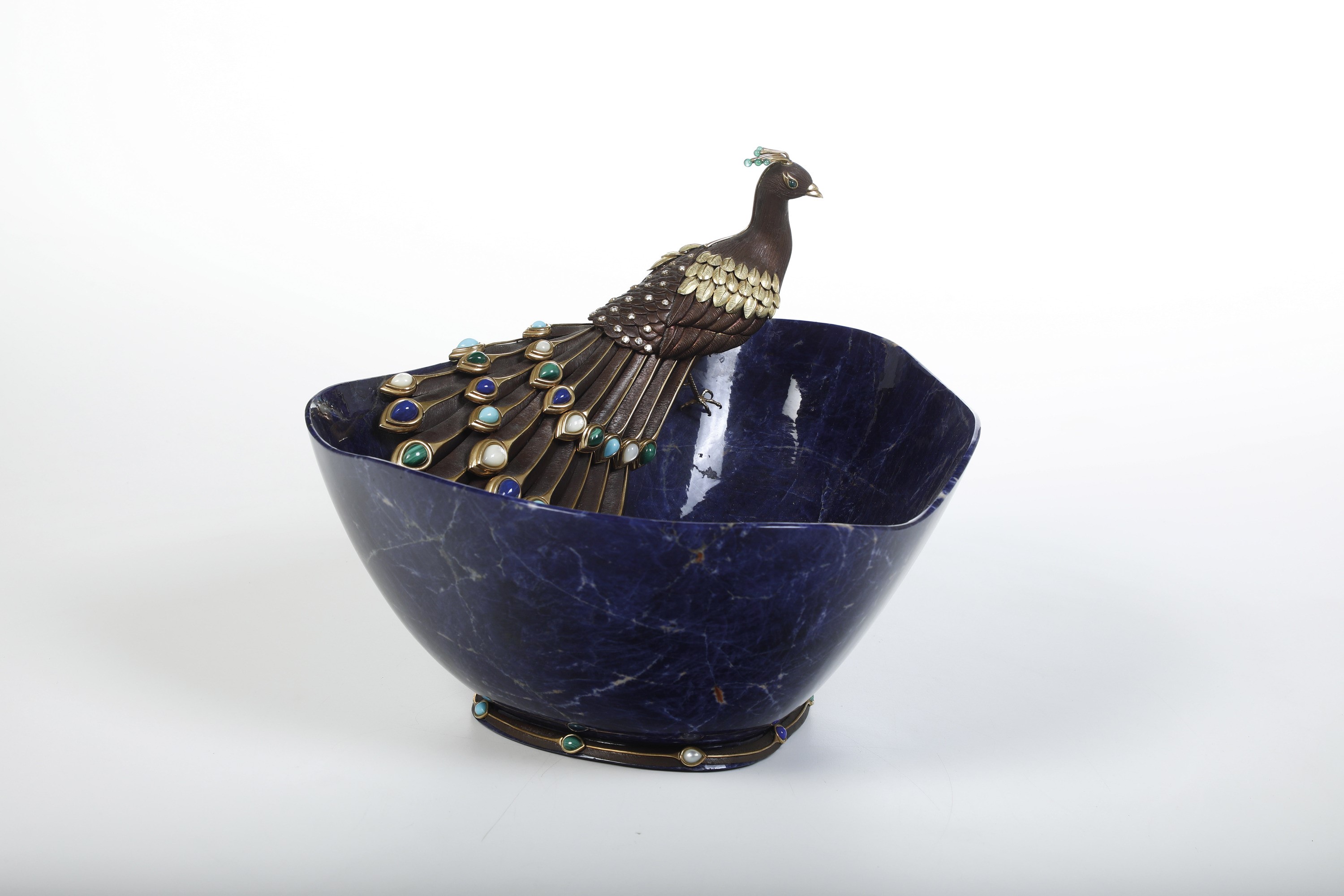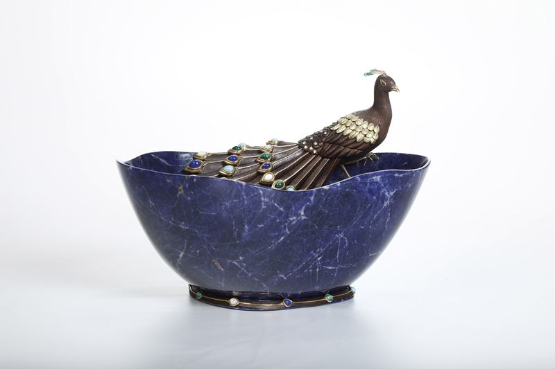 grande centrotavola in lapislazzulo con pavone smaltato con applicazioni di pietre dure e pietre preziose