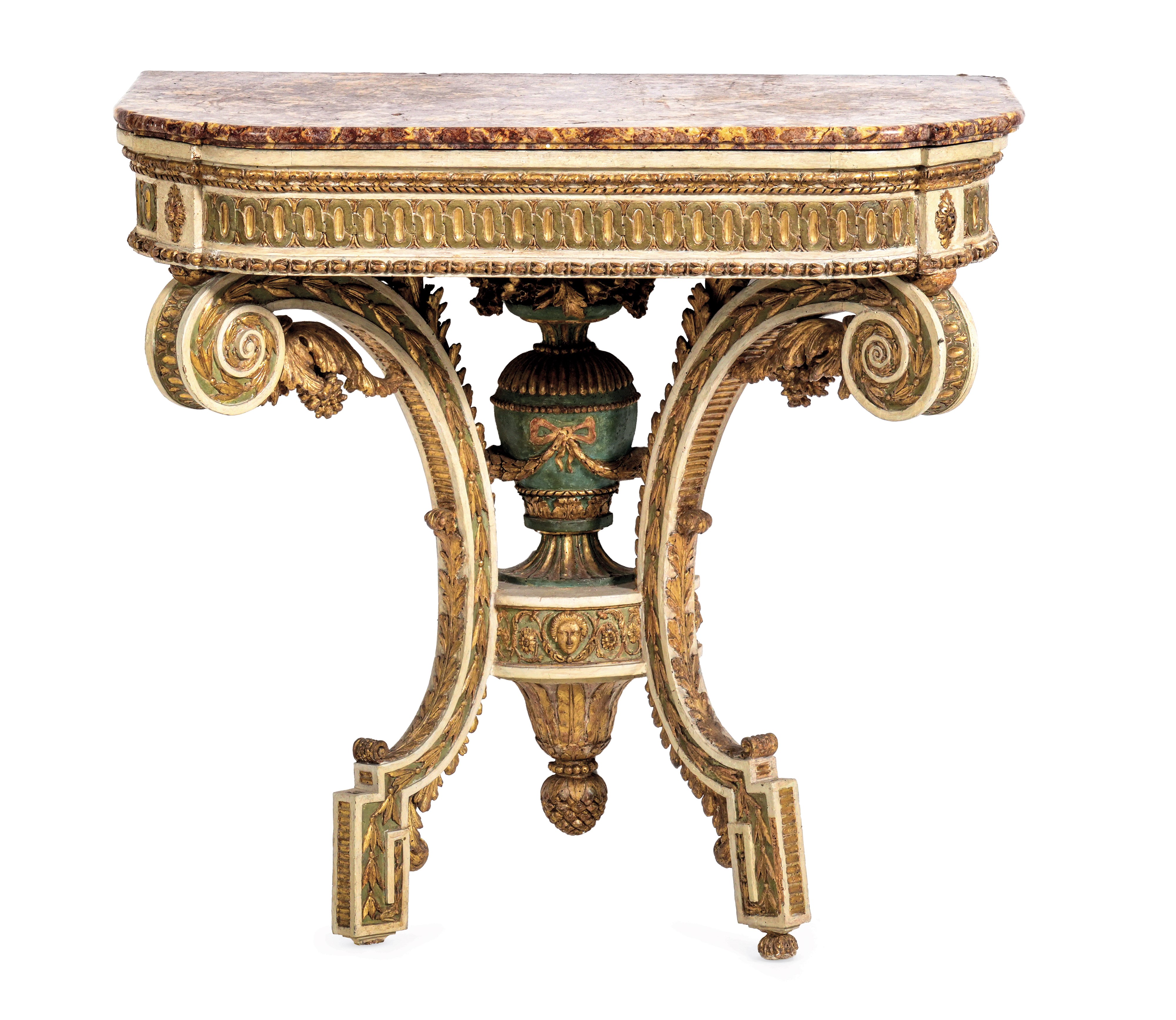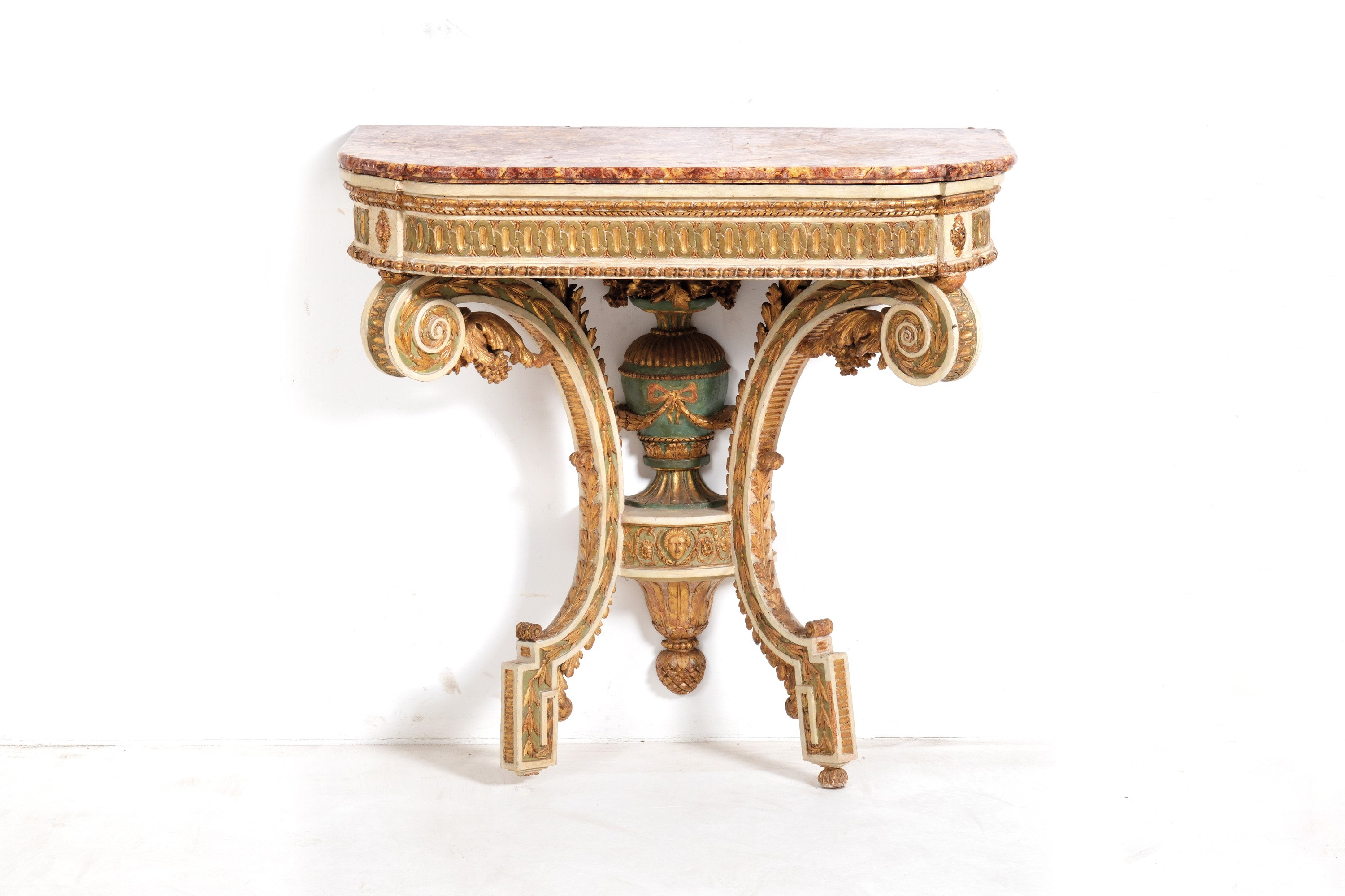 fascia sagomata e baccellata, gambe a voluta intagliate a ricciolo riunite da mensola con vaso fiorito, piano in breccia