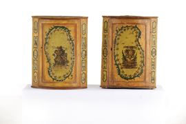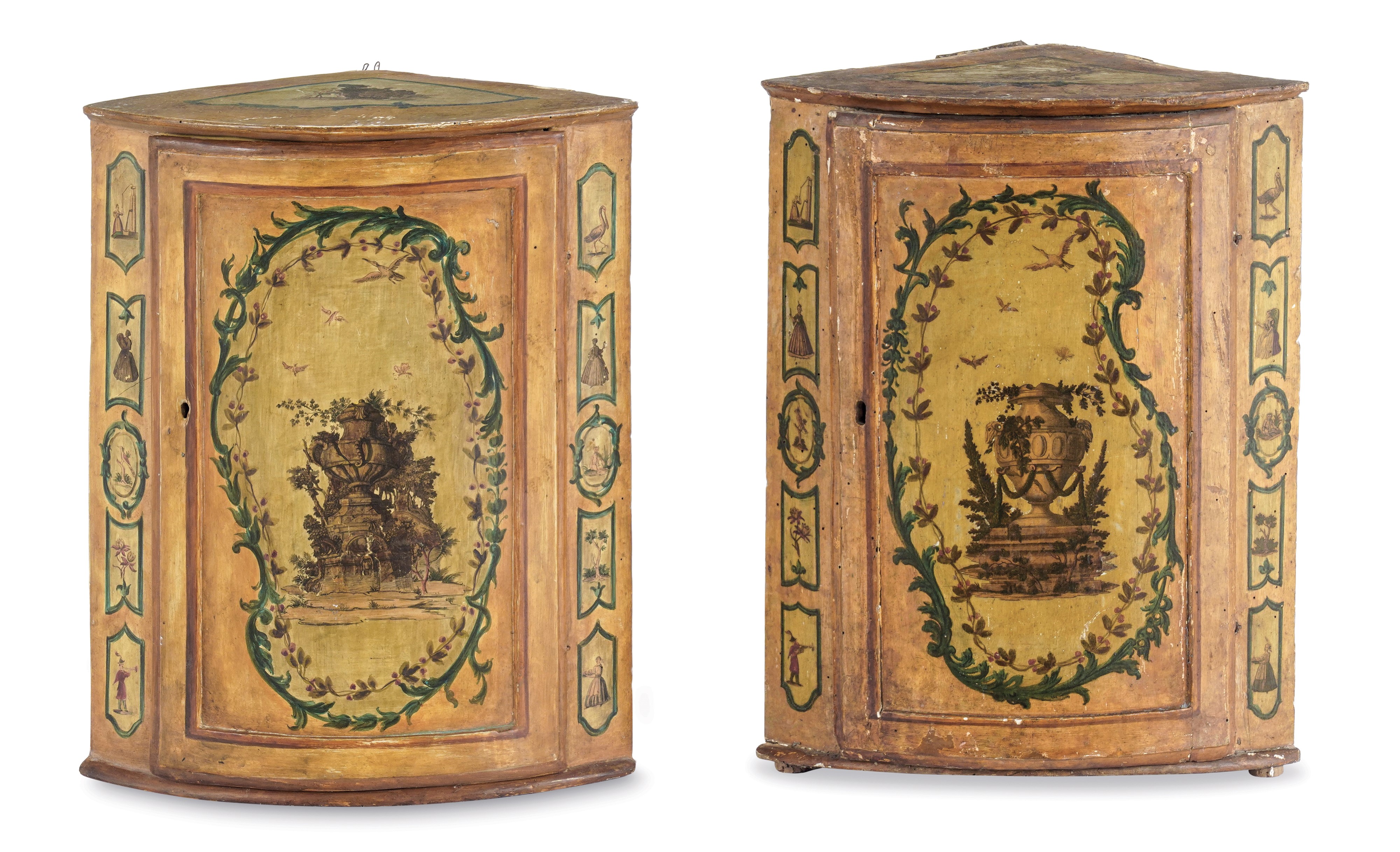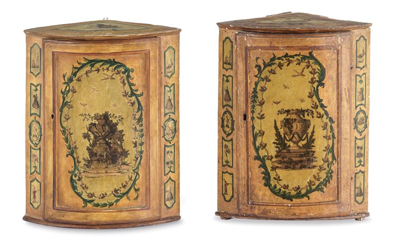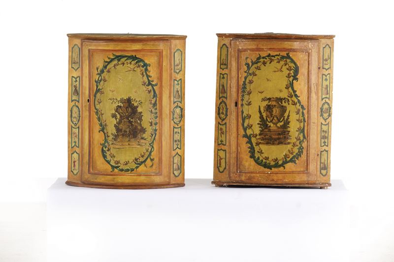 Coppia di angoliere laccate e decorate ad arte povera. XIX secolo
