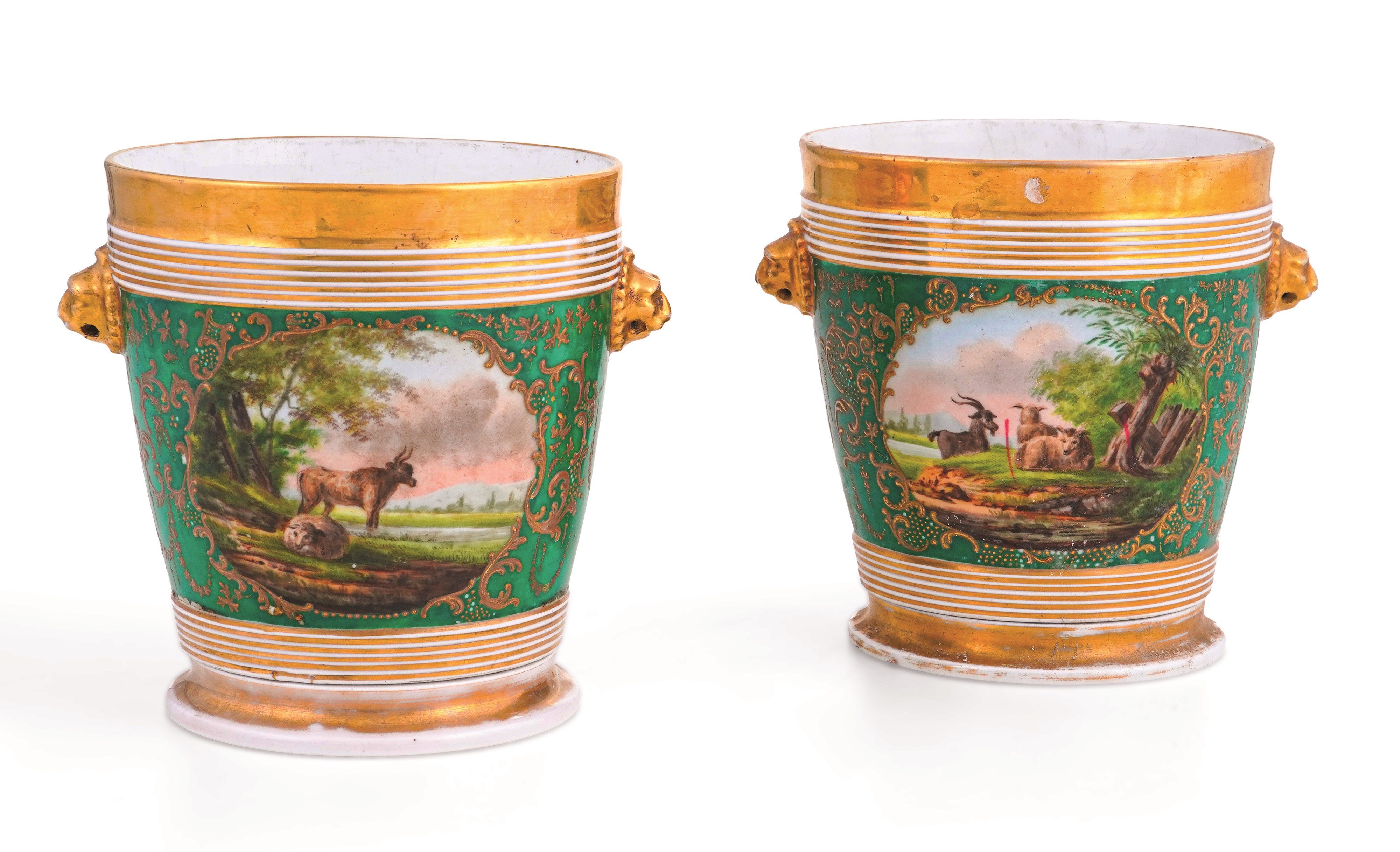 Porcellana. Marca: assente. Altezza cm 18,8. Conservazione: un vaso con felature sul fondo; insignificanti usure all’oro e qualche salto di smalto