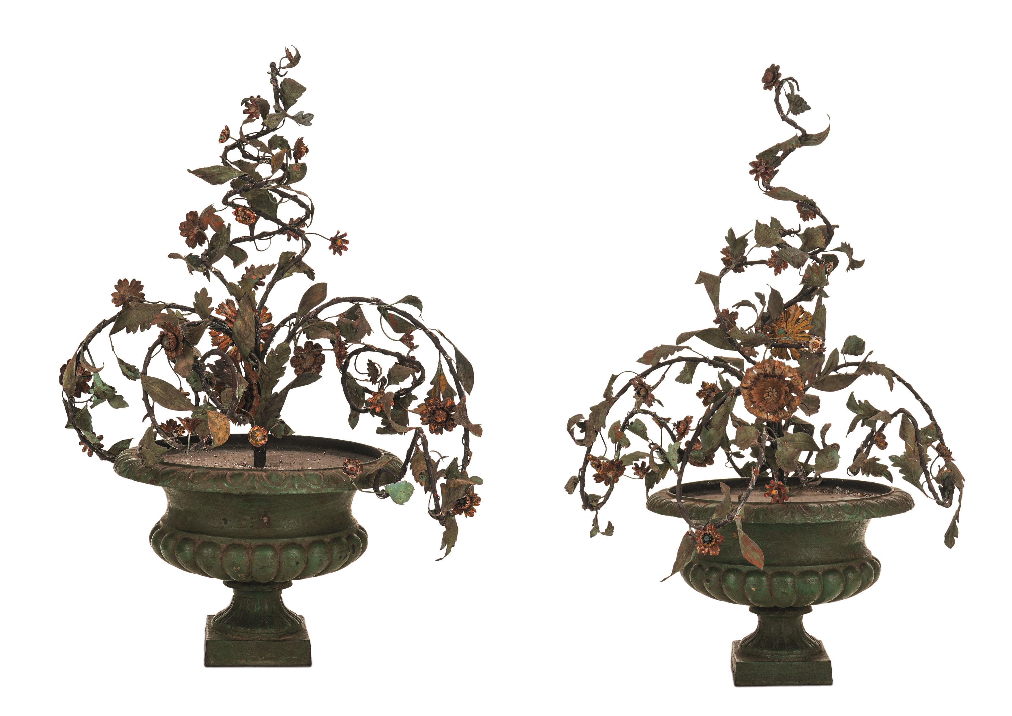 Coppia di vasi in ghisa con applicazioni in metallo. XIX-XX secolo