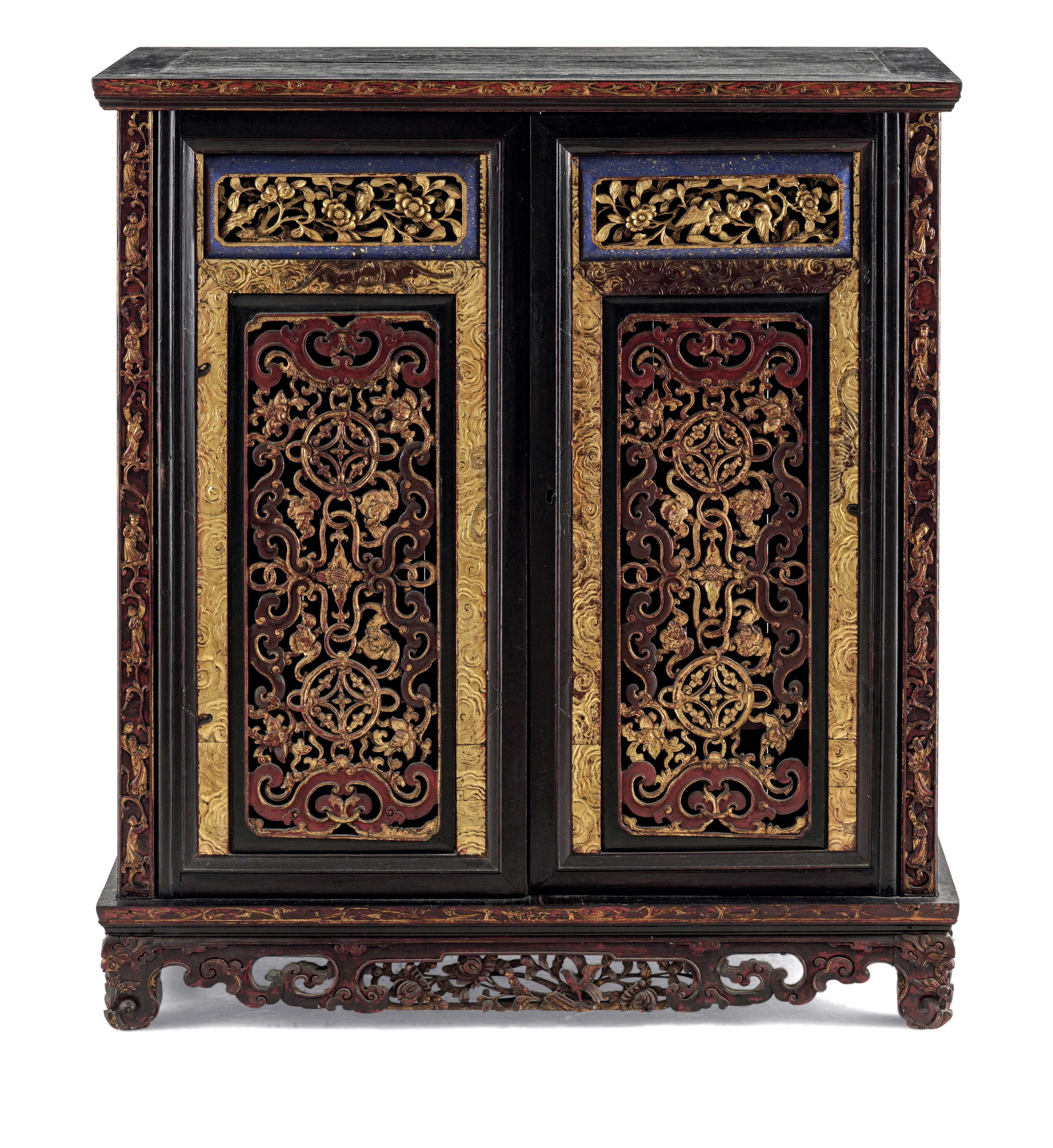 Credenza in legno laccato e dorato con decori naturalistici, Canton, Cina, Dinastia Qing, metà XIX secolo