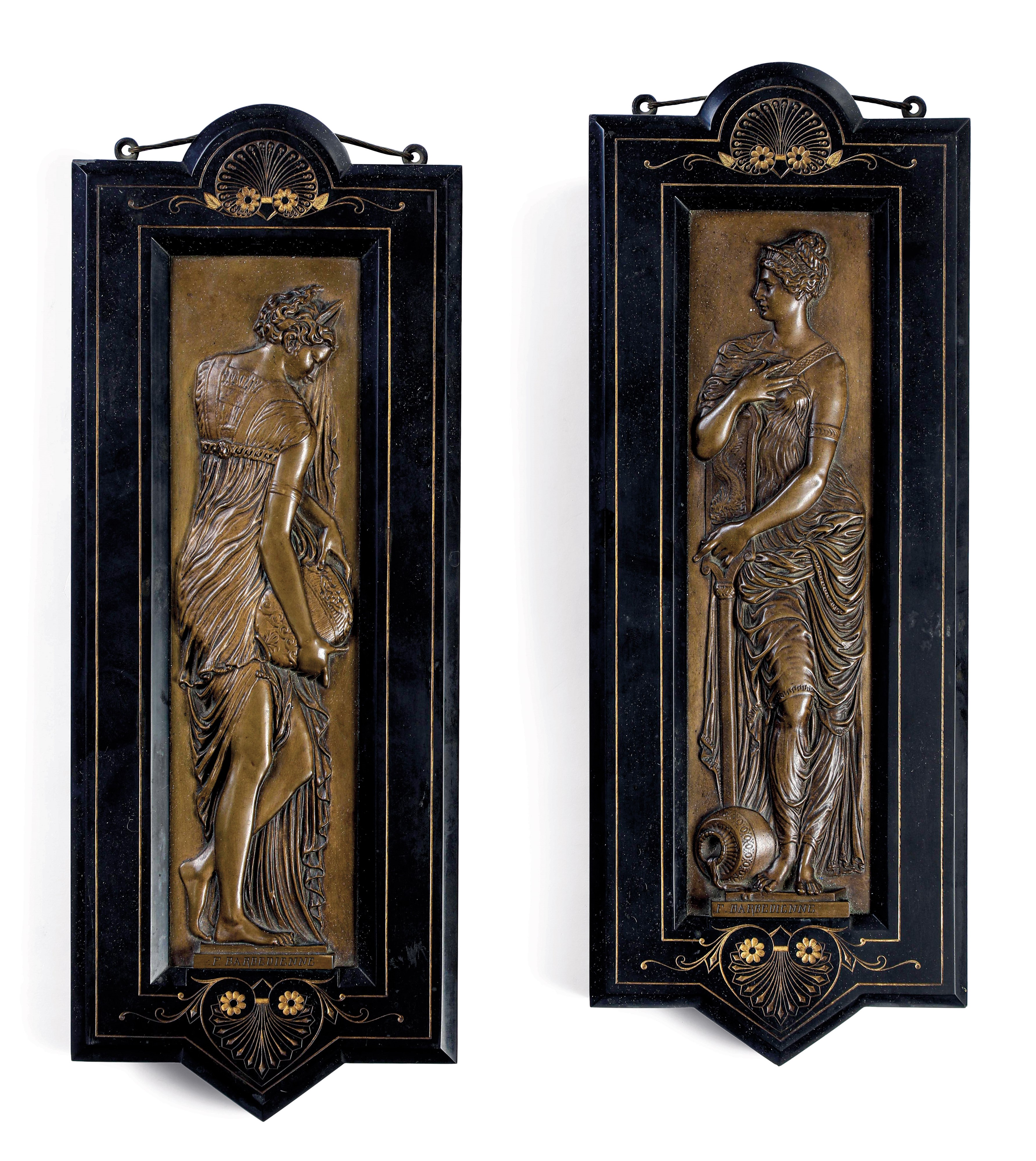 Due placche in bronzo raffiguranti figure femminili. Fonderia Barbedienne. Francia, inizi XX secolo