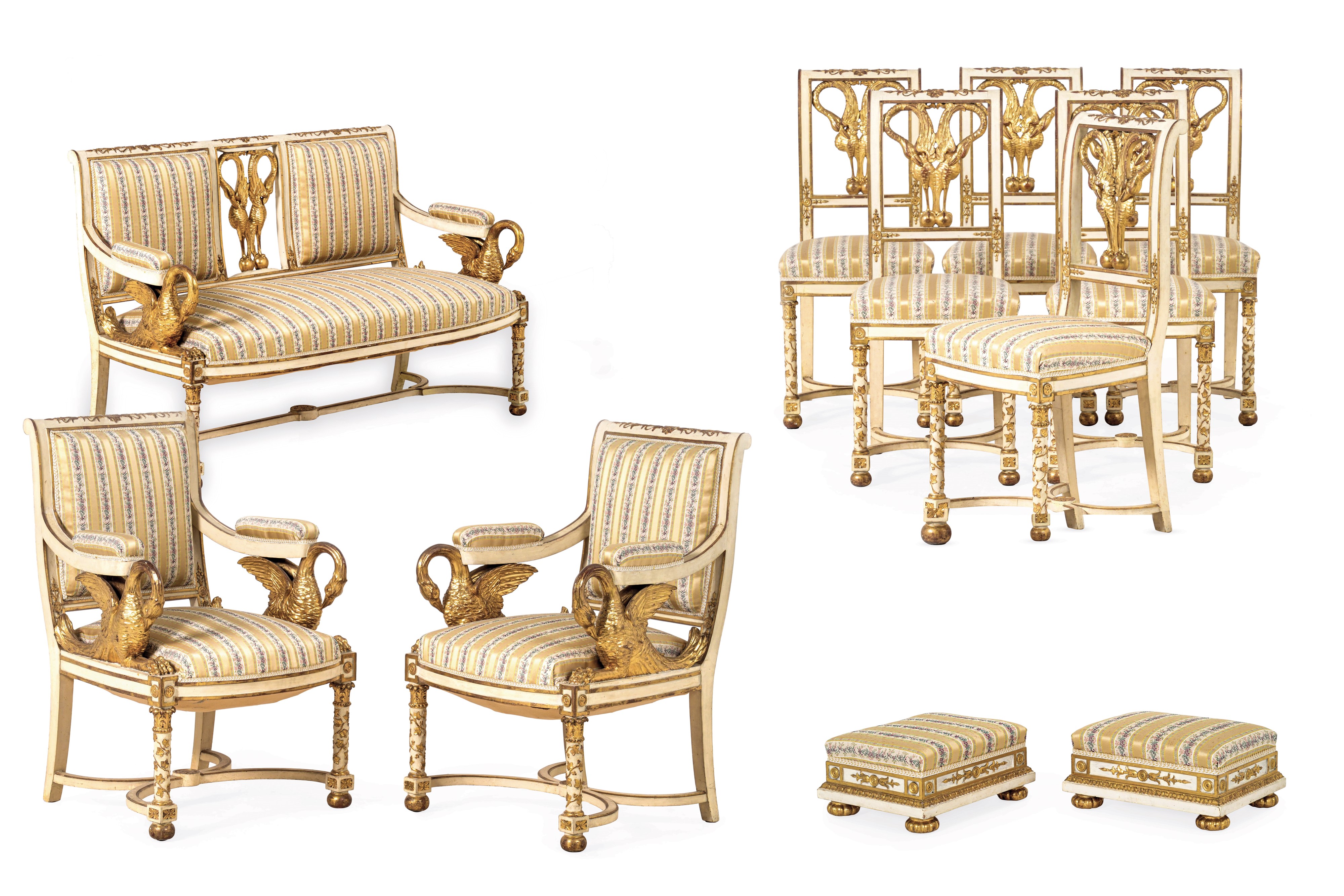 composta da divano, sei sedie e coppia di poltrone con poggiapiedi; decori di cigni dorati a tutto tondo ad arricchire i braccioli e gli schienali, gambe anteriori intagliate con girali di edera (difetti)