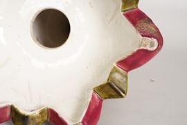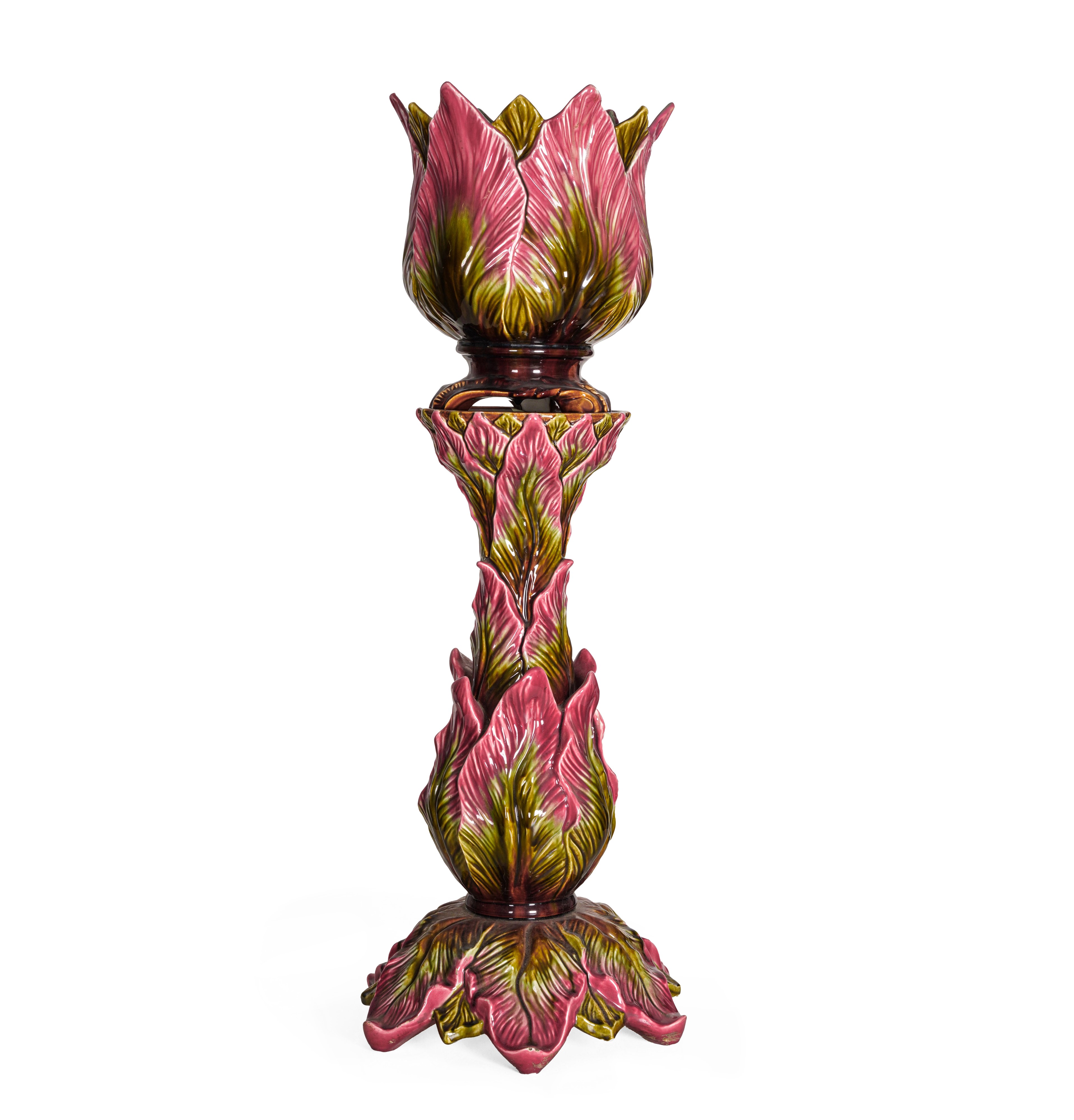 Cachepot portavaso su colonna a balaustro in terraglia a colaggio con decoro di grandi foglie a smalto bicolore